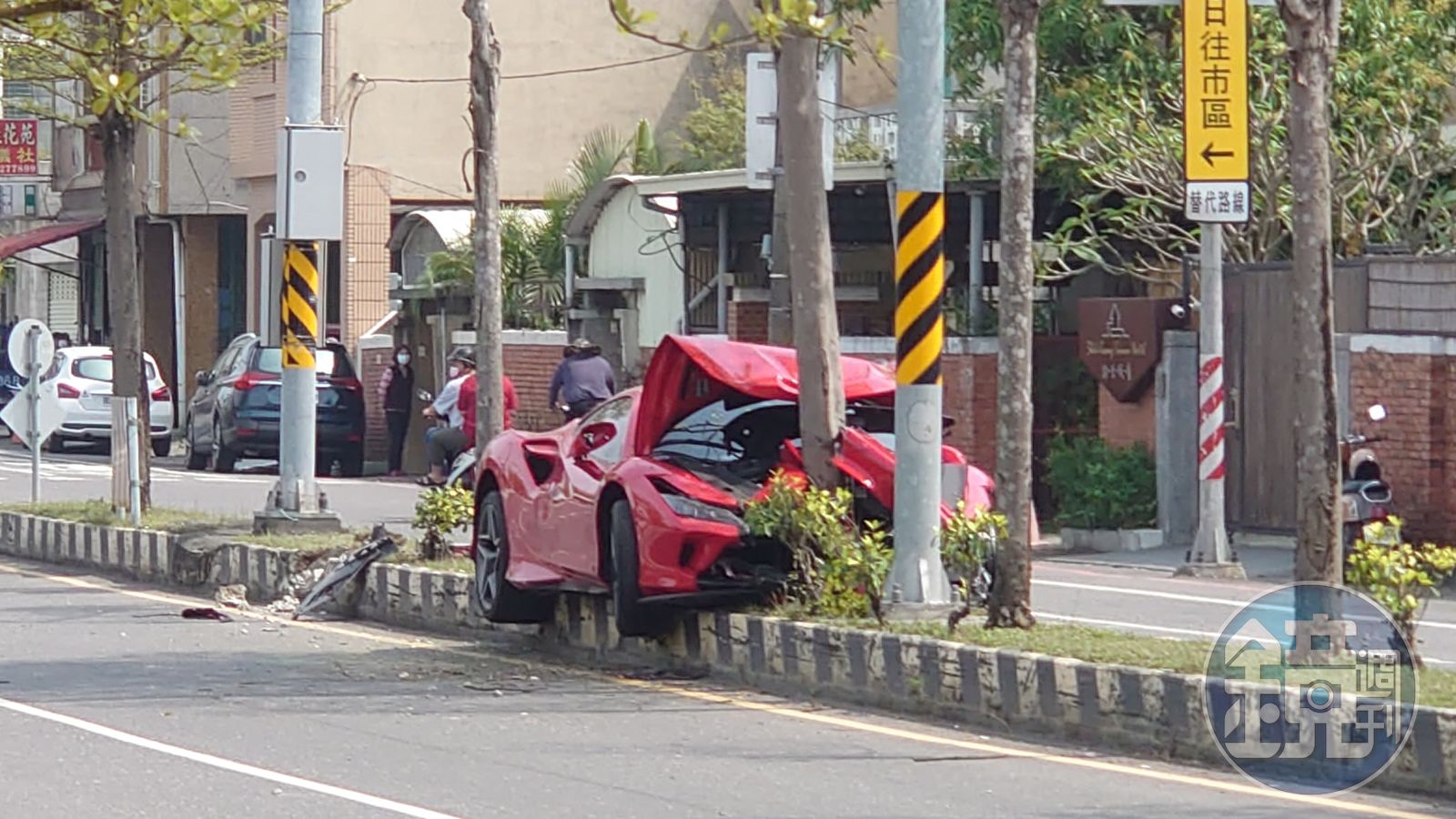 1名網友在「爆廢公社公開版」發文表示,在前往安平老街的途中,發現1台紅色的法拉利竟然衝上分隔島,更慘的是車頭被樹幹劈成兩半,車頭凹陷程度嚴重,引擎蓋更整片掀起,路過民眾也拍下這起超貴車禍,更幽默地說,「馬吃草,發覺到油太貴了,這新車欸!」