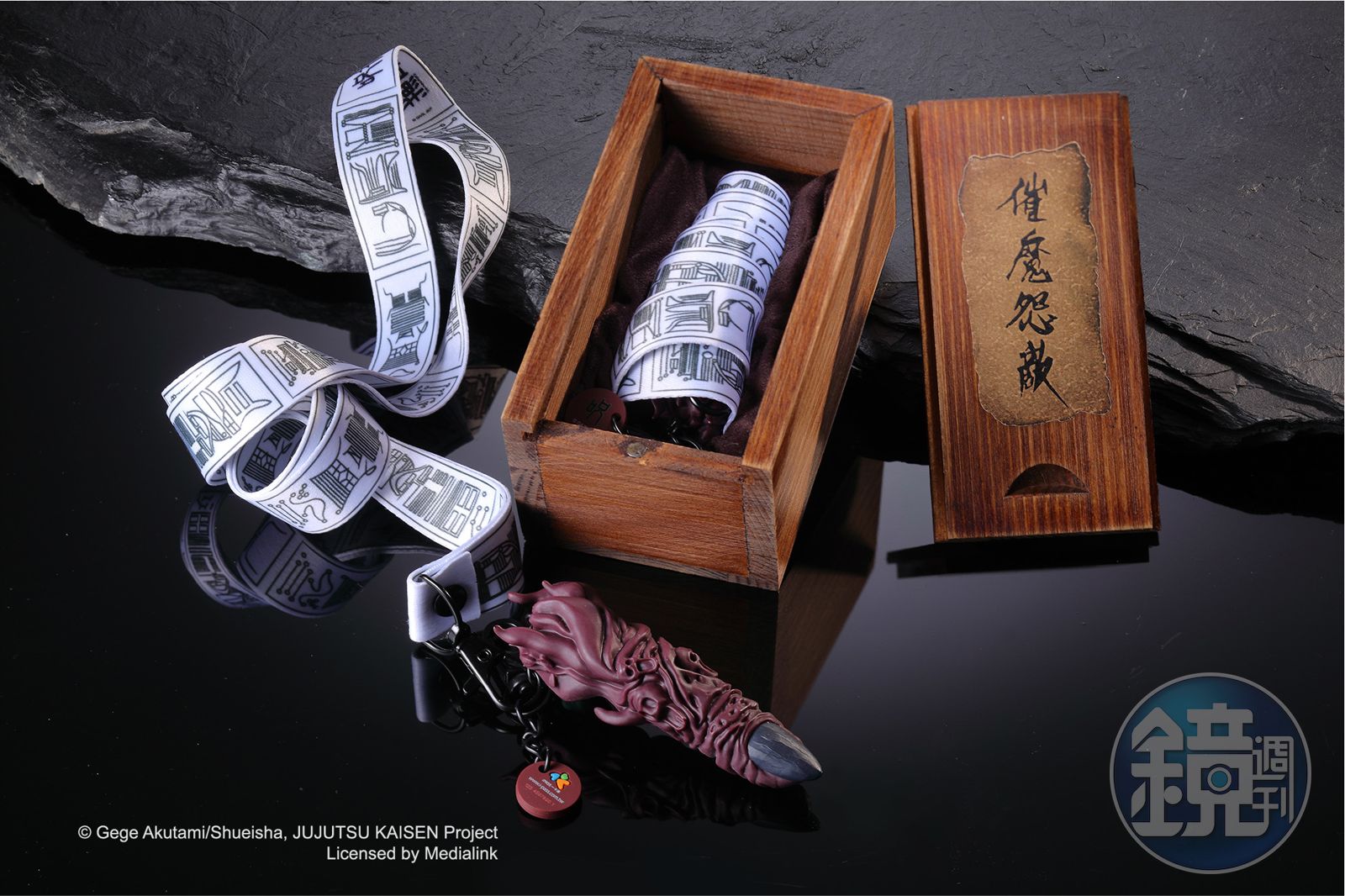 而一卡通公司日前宣布有一款神祕監修中的造型卡,就是「兩面宿儺手指3D造型卡」,使用一體成型翻模,360度呈現扭曲又詭異的細節,綑綁手指的符咒綑布設計成證件掛帶,底襯印有咒術迴戰字樣的3C產品專用擦拭布,將手指封印在木質盒裡。