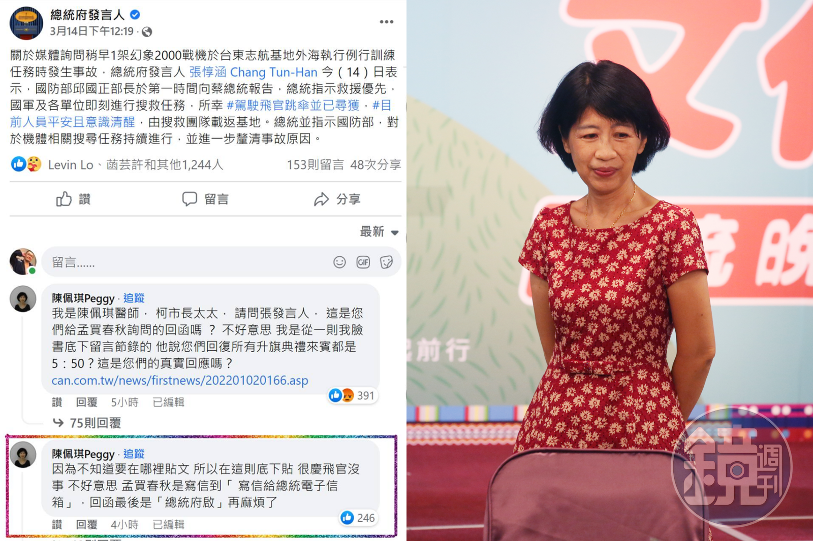 陳佩琪似乎急欲向總統府查證,要求府方立刻進行回覆,竟在昨(16)日至總統府解釋飛官跳傘事件的貼文底下留言,詢問張惇涵「孟買春秋」的截圖內容是否為他們的真實回應。然而不少網友認為她在飛官的貼文底下詢問私事並不妥當,陳佩琪後來才編輯留言表示自己是不知道要在哪裡貼文才會出此下策,並且加上「很慶(幸)飛官沒事」。