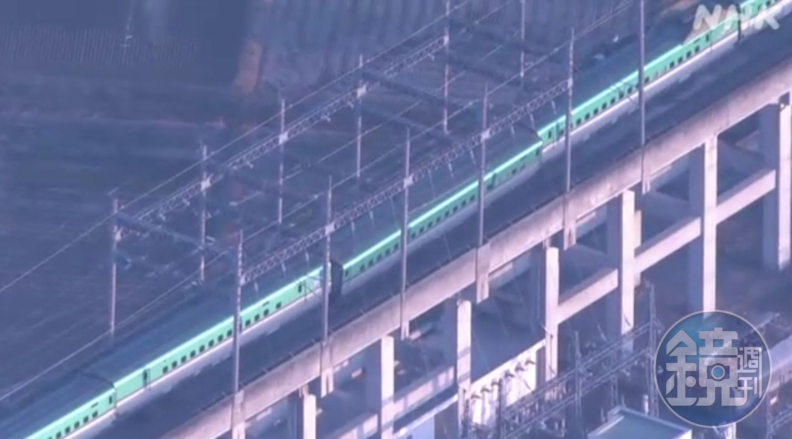 《NHK》今上午更出動直升機空拍新幹線脫軌現場,該班次列車仍停在軌道上,其中一間車廂明顯傾斜,連接的部分並未對齊;更令人擔憂的是,從畫面中更看到列車頭下方高架橋部分橋墩水泥裂開剝落,可輕易看見內部的鋼架。