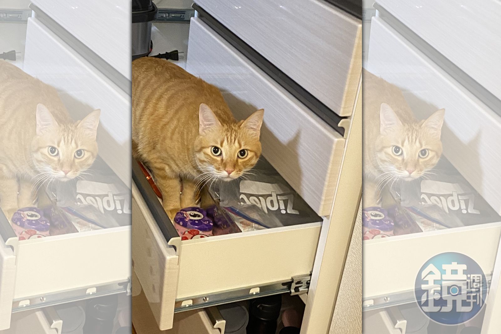 日本一名女網友「tama毛」16日在推特上發文,發生地震當下她想將女兒和狗狗逃走,但卻怎樣也找不到自己飼養的橘貓,在屋內找尋了一陣子後,她發現橘貓正安然無恙的坐在被地震震開的抽屜裡,準備當起「小偷」將抽屜裡的鮭魚乾拿來吃。