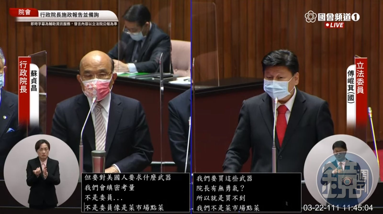 蘇貞昌表示,勇氣始終不減,「但要對美國人要求什麼武器,我們會縝密考量。」傅崐萁打斷:「所以是買不到?」蘇補充:「不是委員好像菜市場點菜一樣,不是。」傅崐萁回嗆:「我們不是菜市場點菜!請不要用這麼粗俗的話語!你是說美國對日本、韓國是菜市場?院長不要用粗鄙的語言!」蘇則反譏:「用閃躲的語言更粗俗、更不敬啦。」