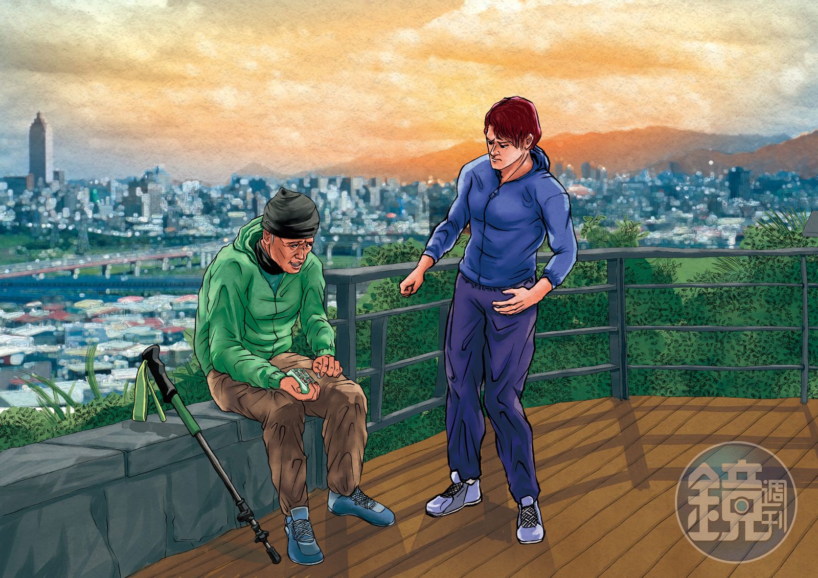 志誠應聲,是他爸爸也下樓了。宋再興同樣一身運動裝扮,但套了一件羽絨外套和圍脖,頭上還戴著一頂毛帽,嚴實的保暖穿著提醒了志誠他父親的年紀。宋再興搖搖手上的登山杖,說:「走吧。」