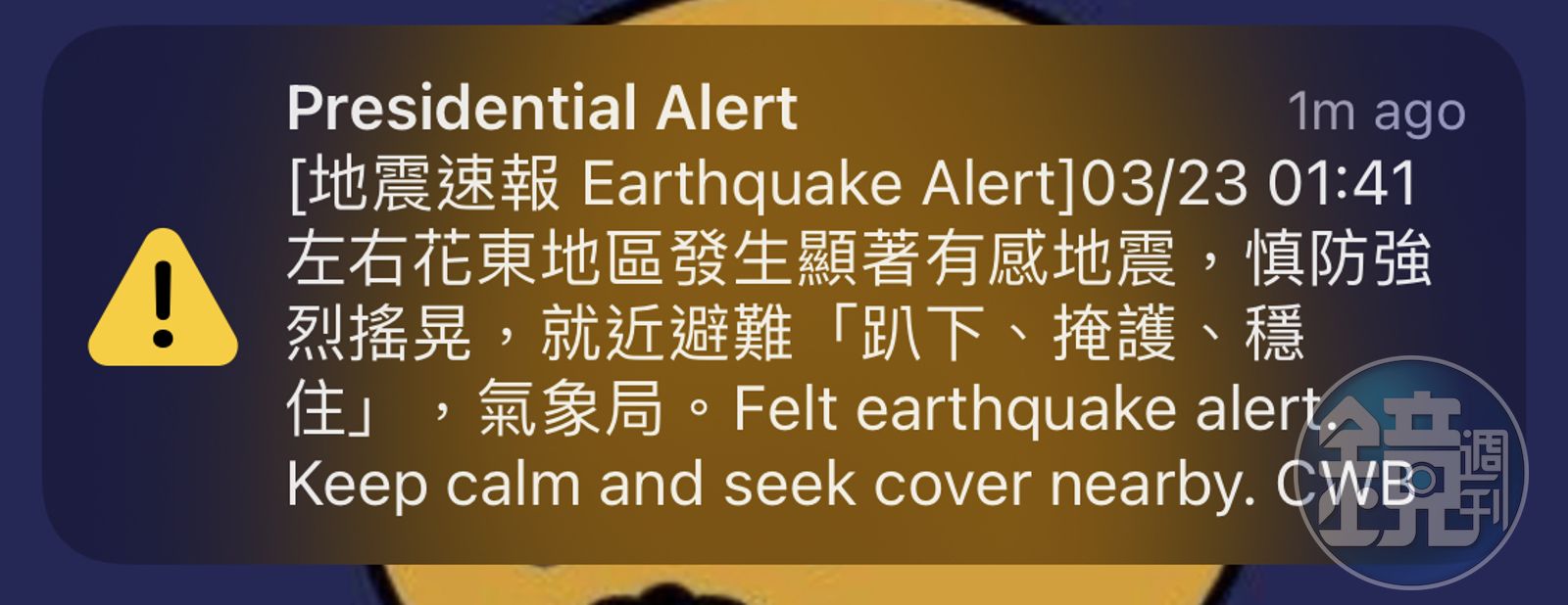 今天凌晨發生強震後,許多網友怕會有餘震,嚇到睡不著,就有網友在PTT發文表示「地震警報一直都被嫌聲音嚇人,剛剛關燈躺上床不到一分鐘警報就響了,滑開螢幕還以為是剛剛地震lag傳來的警報,還在準備發火的時候,一波大地震就馬上傳來,這次應該是警報第一次有作用吧」。