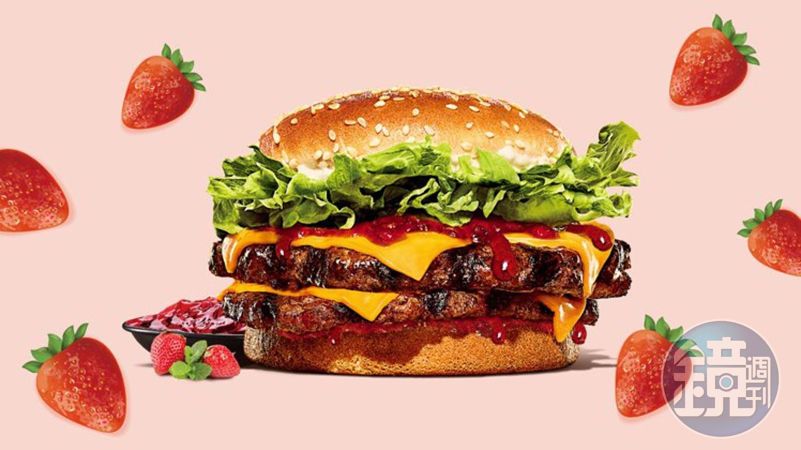 漢堡王曾限時推出「巧克力華堡」、無麵包漢堡「究極重磅火烤牛肉堡」,讓熱愛嘗鮮和嗜肉者一試全新美食體驗,隨著愚人節接近,漢堡王將於3月29日至4月5日限時供應「草莓重磅牛肉堡」,總重8.8盎司的雙層火烤牛肉排,搭上無人工添加草莓醬,讓草莓擁護者們來場味蕾探險,該品項單點179元,套餐219元。