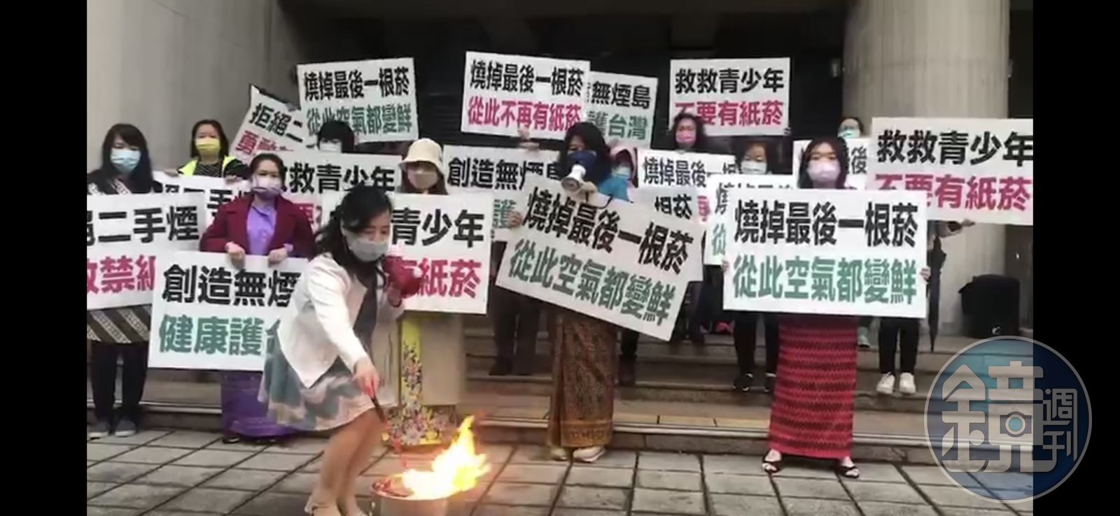 新北市家長志工教育成長協會理事長何若萍和陳情代表廿餘人,手持「拒絕二手菸、勇敢禁紙菸」「創造無菸島、健康護台灣」「救救青少年、不要有紙菸」的手板,在立法院群賢樓前象徵性燒掉數十包紙菸盒和發票,呼籲社會各界支持「無菸世代」。
