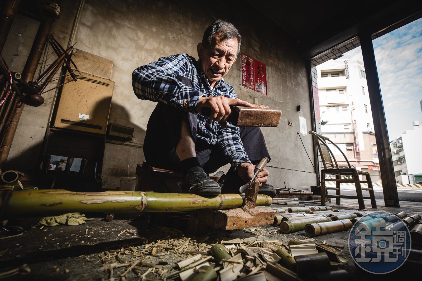 他也曾遇過客人到別處買一張竹椅,摔壞找他修理,「不能修,材料不同,工法也不一樣。」因信二竹店堅持傳統工法-全卡榫結構,全無鐵釘,「竹子再怎麼乾,裡面還是有水分,釘子打進去,過不了多久,釘子生鏽就會斷掉。」這也是為何在921大地震後,全台近8成古蹟、廟宇都找他訂製竹釘,進行修復。
