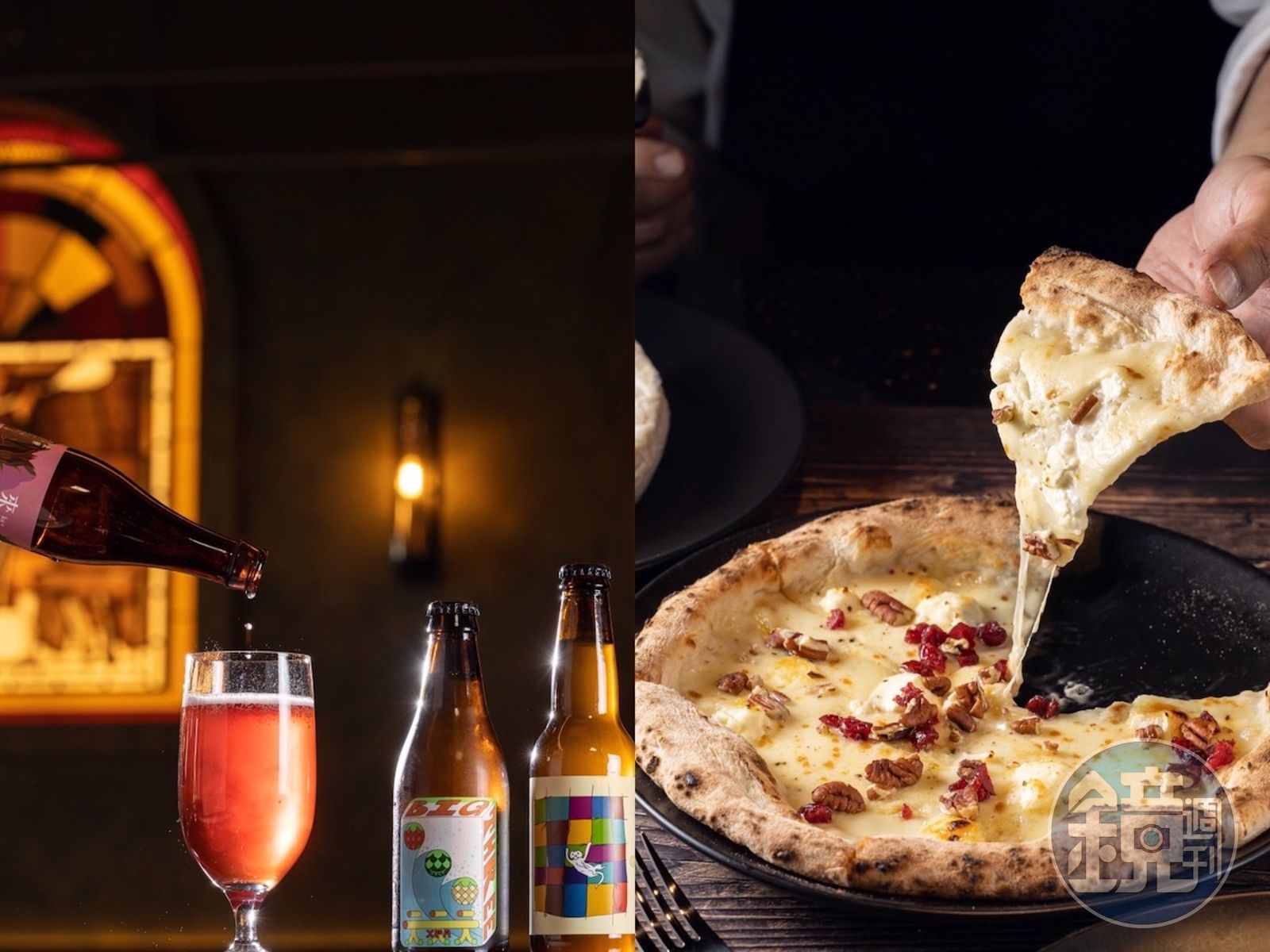 來到這裡,可以選坐在大型窯爐前的板前位置,一邊喝著精釀啤酒,一邊看駐店主廚潘群欣現烤Pizza。潘群欣把莫札瑞拉、瑞可達、馬斯卡朋等多款起司,鋪撒在經過48小時低溫發酵的麵糰,再撒上胡桃、蔓越莓,接著以長鏟推入攝氏400度的磚窯。