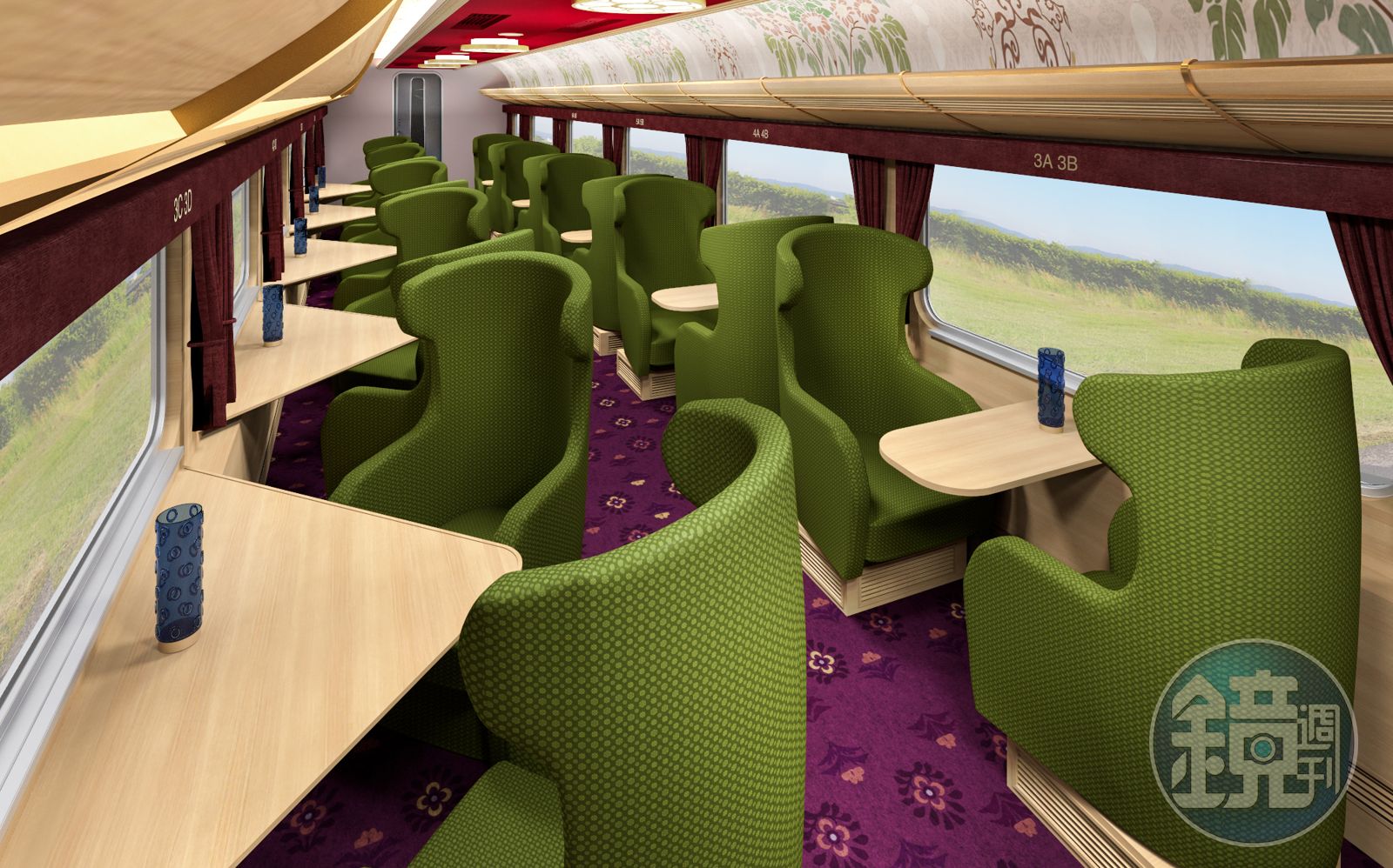 改裝後的座位數只有原本的1/3,提供舒適寬敞的乘坐空間,座位區擺脫電車椅的框架,特別向家具業者訂做沙發椅。進到車廂中,可以看到原本一排4個的電車座椅改為靠窗設置的兩兩雙人座以及3至4人用的沙龍座,而且都有專屬的超大觀景窗,讓旅客盡收車窗外的美景。