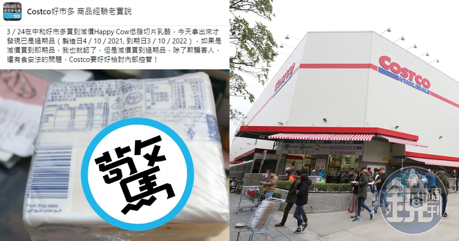 一名網友在臉書社團「Costco好市多 商品經驗老實說」發文,表示自己24日到中和好市多買到特價的切片乳酪,今天拿出來看才發現商品早在10日就過期了,讓她氣得表示,如果是買到特價即期品就算了,但這是過期品,根本是欺騙客人,還有食安疑慮,要好市多「要好好檢討內部控管!」