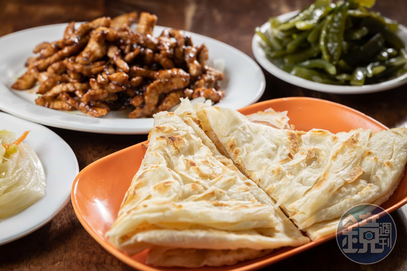 斤餅全程都在用餐區旁製作,從擀麵開始,師傅的快手就讓人眼花撩亂。麵皮擀開疊層後會先捲成如玫瑰花般的麵糰,下鍋前才攤成圓餅狀。雪白軟柔中帶點焦褐的斤餅,單吃麵香馥郁,包京醬肉絲或小菜又是另種飽滿風味。(斤餅單點60元/份,京醬肉絲組合160元/份)除了單吃,也可夾京醬牛、豬肉絲,店長也加碼透露,有許多老客人吃著吃著,已經研發出夾泡菜、夫妻肺片等小菜的吃法,看來這些饕客也是眷村菜系的改良者之一呢!