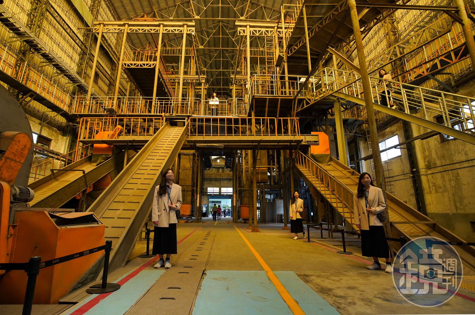 過去菸廠一樓的菸葉複薰加工區,後期因包裝機的高度需求,曾改建屋頂,衍生出以鋼架構成椼架,再加上玻璃纖維波浪板組合而成的高低窗景,獨特造型像是山脈重重,而有「山形牆」之名。我走上貓道,凝視著山形牆透出的淡淡黃光,彷彿那年夕陽永不西下,時光凍結在1936那年。