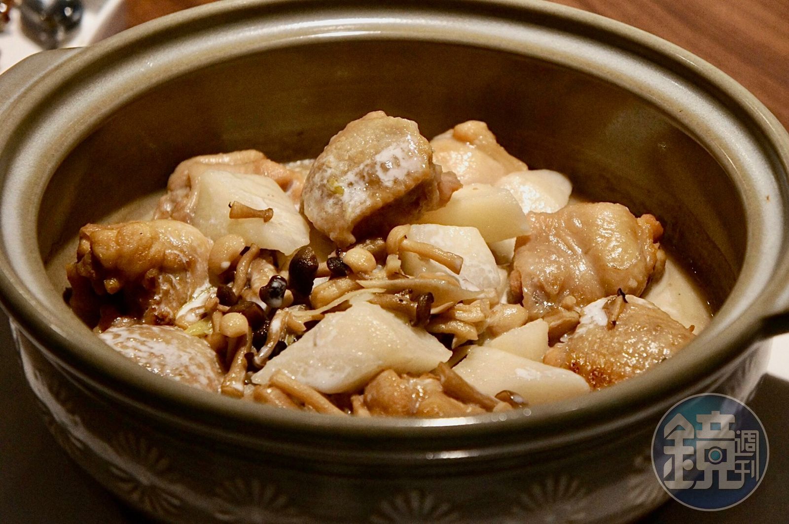 小菜帶有氣勢,隨後登場的大菜則細節繁複。譬如,「芋香雞中煲」是升級版的「滑雞煲」,在去骨雞翅裡塞入芋頭條、縫起缺口,煎到翅翼定型再炒燴燜煮,咬下時,肉嫩餡滑,包裹在翅翼裡的芋香綿綿,整道菜只聞芋香,不見芋頭的濃稠感,工法細膩,口感及調味平衡適口,令人驚艷。