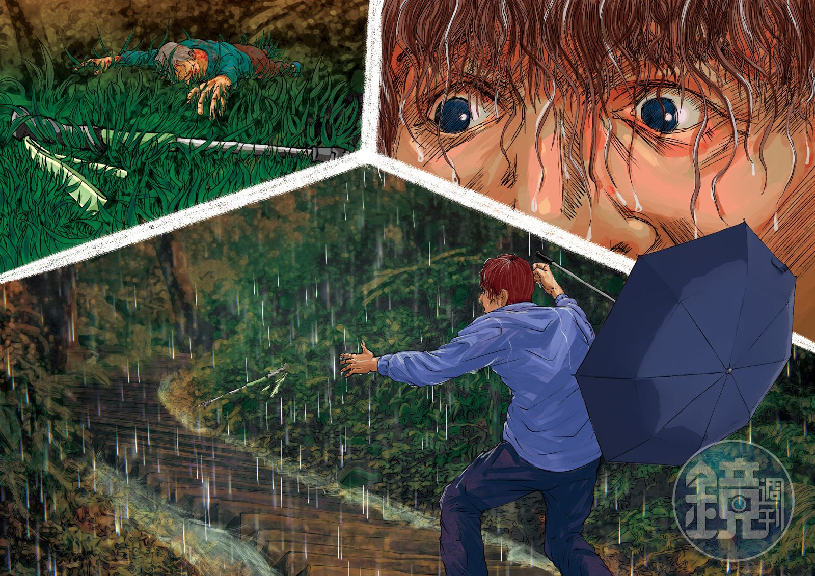 宋志誠心臟一下子就凝結了。他沒辦法做任何簡單的思考,僅能本能地湊近那支登山杖。他彎著身體、壓著脖子要去撿拾它—手伸進了水中、爛泥巴、死去一般的雜草、傾倒一片的粗細樹枝。好不容易摸到了那支卡得極深的手杖,正要一鼓作氣抽出來,他就看見了。