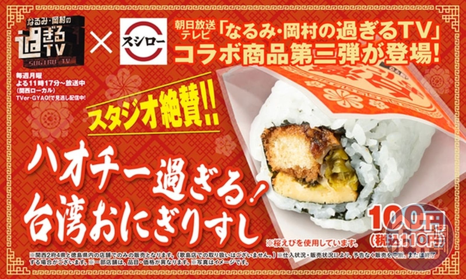 日本朝日電視台綜藝節目「なるみ・岡村の過ぎるTV」和壽司郎近期推出聯名商品,其中包括蘋果鮭魚壽司、炸鮪魚壽司,企劃第三彈則推出台灣飯糰壽司,與傳統台灣飯糰不同,壽司飯糰內包的油條換成炸過的海綿蛋糕,增加脆甜口感,再搭上蛋、高麗菜、櫻花蝦最後再撒上五香粉,每個售價100日圓(約新台幣24元)。