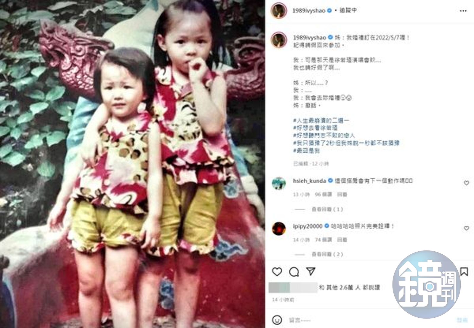 邵雨薇透露,姊姊通知她,「我婚禮訂在2022/5/7喔!記得請假回來參加。」但邵雨薇卻回應,「可是那天是徐若瑄演唱會欸……我也請好假了啊……。」但在姊姊詢問下,卲雨薇坦承,自己猶豫了兩秒,決定還是放棄演唱會,去參加婚禮,還遭姊姊揶揄:「一秒都不該猶豫。」同時邵雨薇還附上自己和姊姊小時候的合照,呈現出姊妹情深的模樣。 而這篇兩難的貼文,也釣出徐若瑄回文說:「還是我陪妳一起去妳姐姐的婚禮,唱《別人的》祝福她」,讓邵雨薇相當驚喜地表示:「啊啊啊啊啊 尖叫了!太多歌喜歡了,還是唱《姐妳睡了嗎》?」