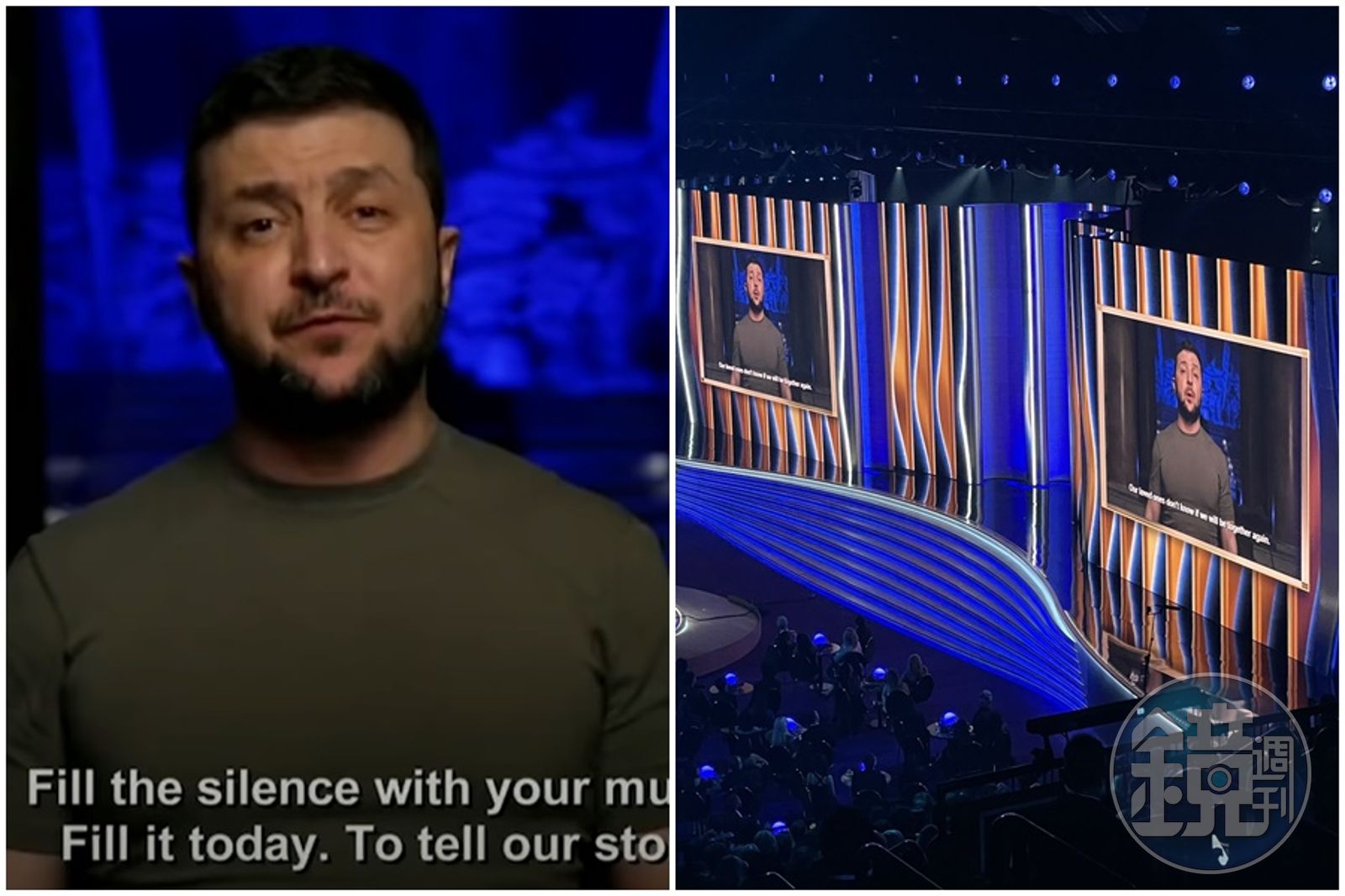 連烏克蘭總統澤倫斯基透過影片在葛萊美獎典禮上發表演說。(翻攝自推特)發布時間:2022.04.04 12:11 臺北時間