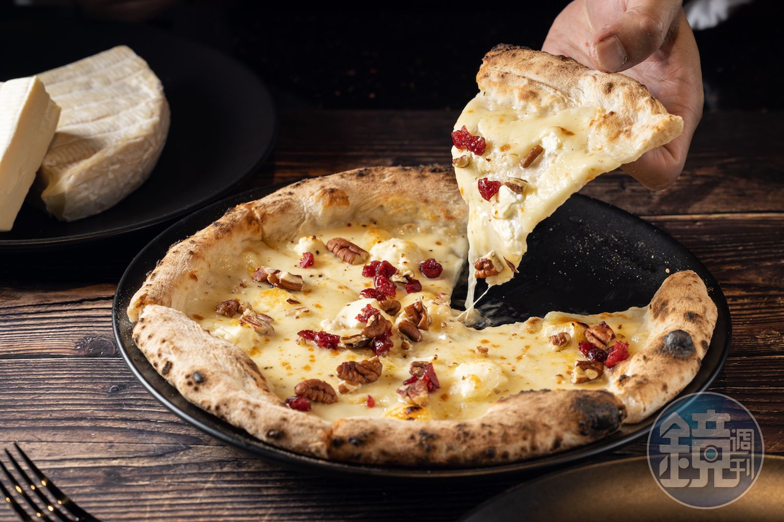來到這裡,可以選坐在大型窯爐前的板前位置,一邊喝著精釀啤酒,一邊看駐店主廚潘群欣現烤Pizza。潘群欣把莫札瑞拉、瑞可達、馬斯卡朋等多款起司,鋪撒在經過48小時低溫發酵的麵糰,再撒上胡桃、蔓越莓,接著以長鏟推入攝氏400度的磚窯。