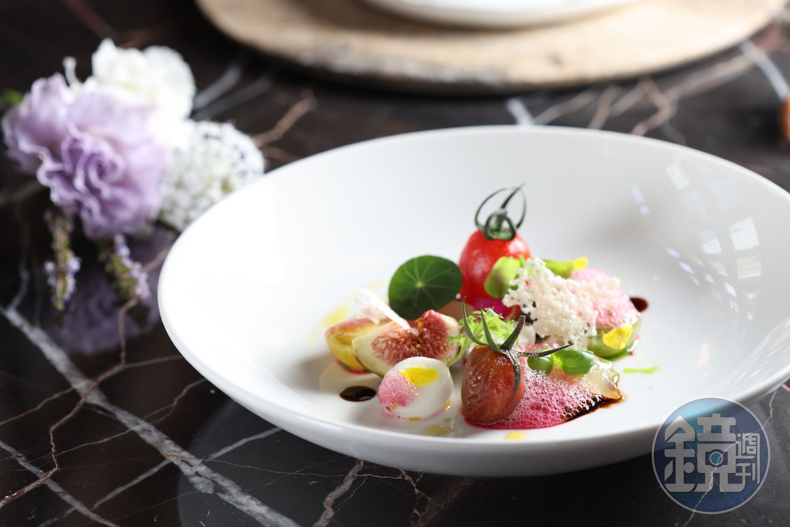 沙拉「彩色番茄.莫札瑞拉.番茄凍.無花果.紅酒泡泡」,集合了各式形態的番茄及醬汁,在盤間上演廚藝成果展。(1,580元套餐菜色)發布時間:2022.04.08 05:57 臺北時間