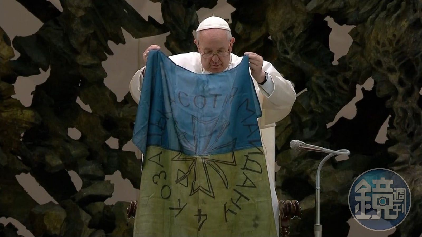 對此,85歲的教宗方濟各在每週例行接見信徒的場合中表示,近來烏克蘭戰爭的新聞並未帶來寬慰與希望,而是發生了新的暴行,例如在布查的屠殺;殘酷之舉越來越駭人,甚至向平民、手無寸鐵的婦孺下手,這些人是受害者,他們無辜的鮮血向天堂哭喊、哀求「停止這場戰爭!」;方濟各緊接著拿出一面來自殉難城市「布查」的烏克蘭國旗,並將該國旗折整齊,並親吻旗面。