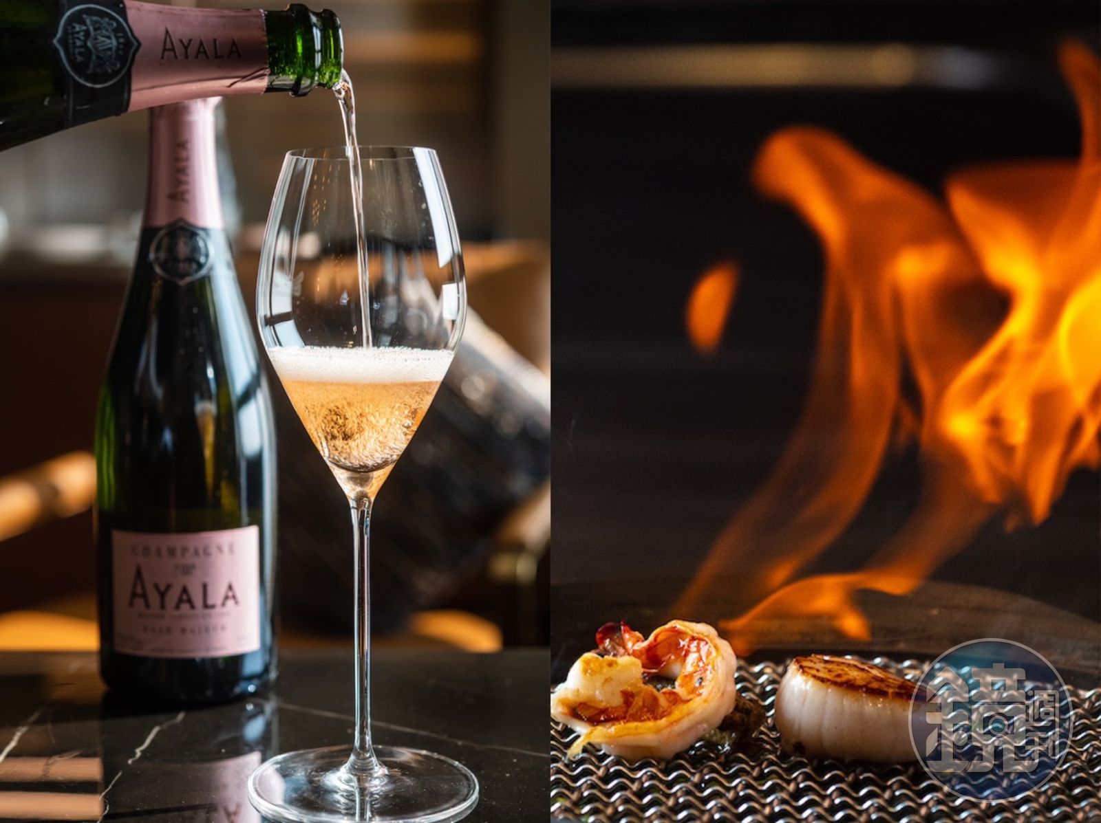 「焰鐵板燒」被喻為是全台最美高空海景鐵板燒,就在這個擁有魔幻光線的時刻,漢來餐飲部督導暨餐酒專家周裕翔(Andy)遞來「法國香檳區艾雅拉梅傑粉紅香檳」,鐵板檯區裡廚師團隊正在烤松茸、沖「茶湯」,有這麼一小片刻,這些儀式感創造的氛圍領人逸離日常,午宴這也才剛開場,愉悅感已隨杯中的粉紅泡泡躍升翻滾。
