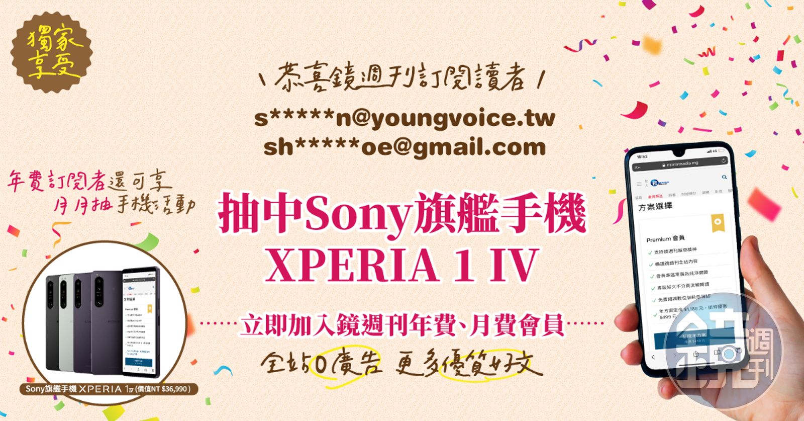 「加入鏡週刊會員,限時獨享5夠賺」活動,只要在8月31日前以優惠價499元(原價1,188元) 成為《鏡週刊》年費會員,不僅獨享全站0廣告無擾閱讀環境、閱覽獨家深度好文、免費看動態雜誌,更能享有月月抽Sony旗艦手機資格,獎項包括Xperia 1 III(價值NT$36,990)、Xperia PRO-I(價值NT$48,880)、Xperia 1 IV(價值NT$36,990)三款機型,活動期間總計將送出12支手機。