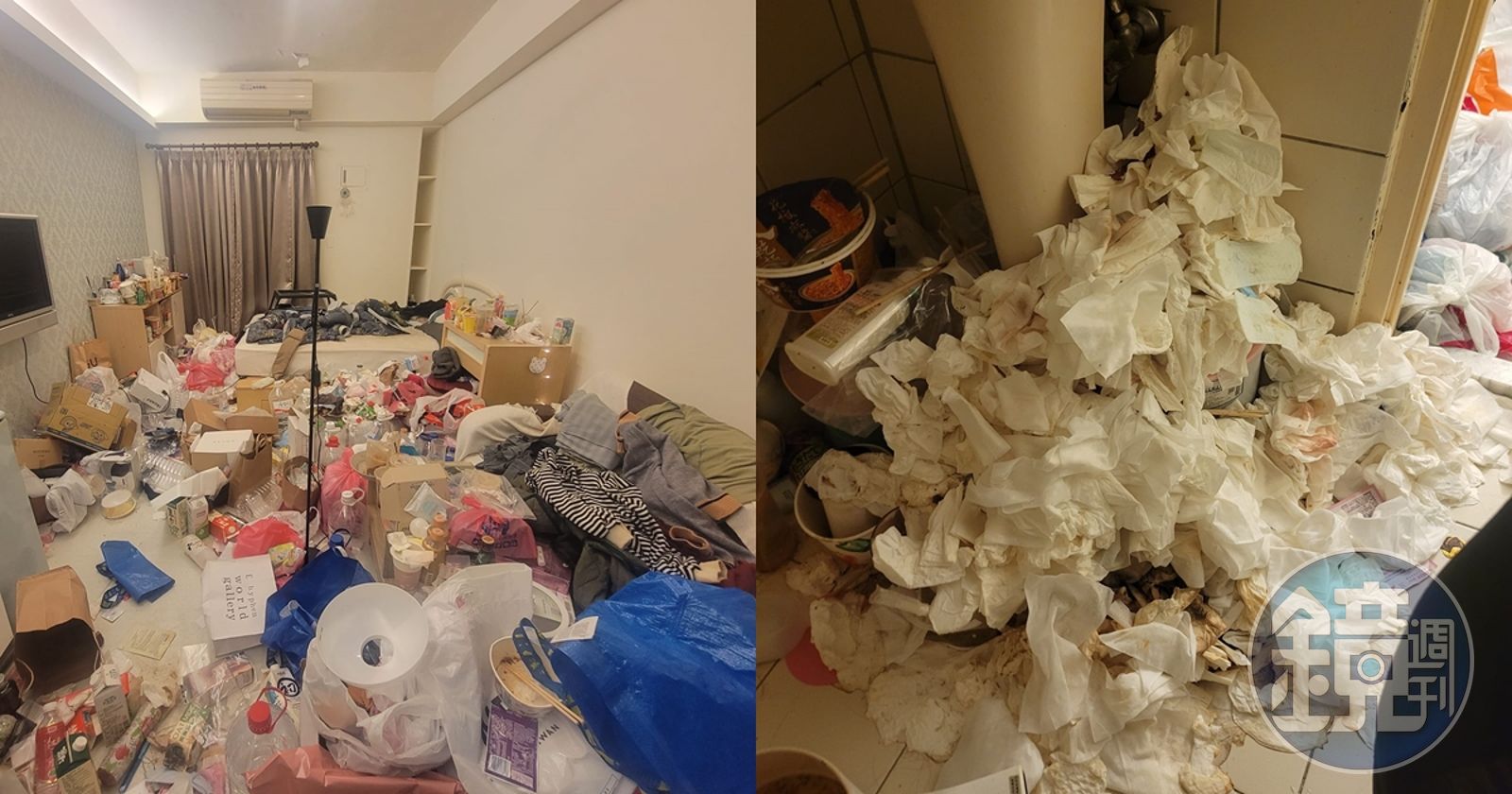 原PO表示,她的房間內布滿上百件蕾絲內衣褲,衛生棉也超多,從附上的照片可以看到,套房內堆滿了垃圾、瓶罐、吃完的食物盒子等,沙發上滿是衣物,除了床以外,可以堆東西的平面都是垃圾,連走路的空間都沒了,廁所的垃圾桶也滿到炸了出來,衛生紙堆了半個洗手台高,還有不少衛生棉。