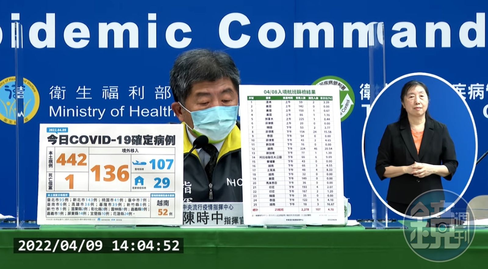 指揮中心表示,今日新增之442例本土病例,為230例男性、212例女性,年齡介於未滿5歲至80多歲,發病日介於今年2月1日至4月9日,其中包含250例為無症狀感染。個案分布為新北市(143例),台北市(95例),桃園市(41例),基隆市(39例),高雄市(38例),花蓮縣(24例),屏東縣(14例),宜蘭縣(10例),嘉義縣(9例),新竹縣(8例),台中市(7例),台南市(6例),彰化縣(3例),苗栗縣(2例),新竹市、雲林縣及嘉義市(各1例)。相關疫情調查持續進行中。