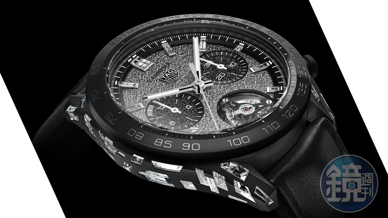 在LVMH集團的成員裡面,泰格豪雅算是在材質領域滿敢創新嘗試的品牌之一,他們進可攻、退可守的價位帶也成為優勢,想中規中矩的時候就在中價位款式做性能上的優化,而偶爾想創新之際也有台幣百萬元的區間可以讓他們做變化,這次的Carrera Plasma鑽石陀飛輪就展現了這個特質。泰格豪雅以化學氣相沉積技術(Chemical Vapour Deposition,CVD)在實驗室培育出不同形狀和紋理的鑽石,而他們把這個獨家的人造鑽石鑲嵌在錶殼和時標上,巨大的鑽石錶冠也是很吸睛的亮點,這是來自品牌和鑽石設計公司Capsoul的合作,兩側的按把則以ADLC碳鍍層處理,錶冠和按把都具有相當高的硬度。