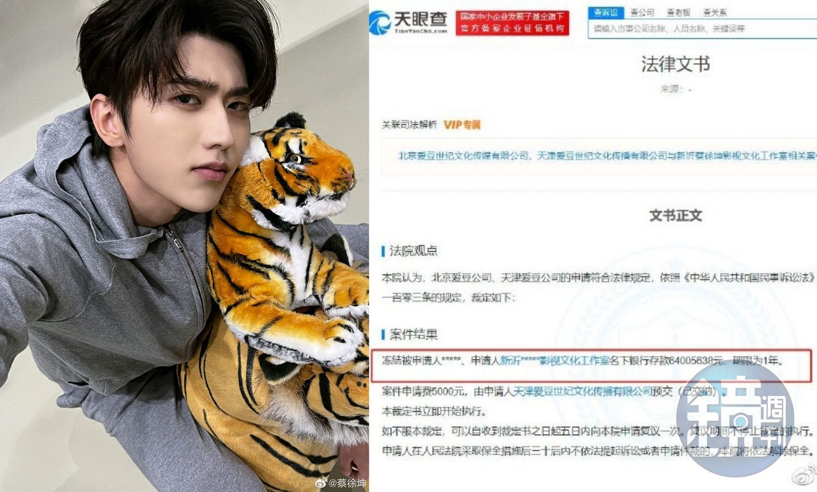 據大陸天眼查App顯示,北京、天津兩家愛豆世紀文化傳媒有限公司與新沂蔡徐坤影視文化工作室的非訴財產保全審查裁定書被公開;這兩家愛豆世紀公司向法院申請財產保全,請求凍結被申請人蔡徐坤、新沂蔡徐坤影視文化工作室名下銀行存款人民幣6,400萬餘元,期限為1年,法院認為該申請符合法律規定,裁定凍結。