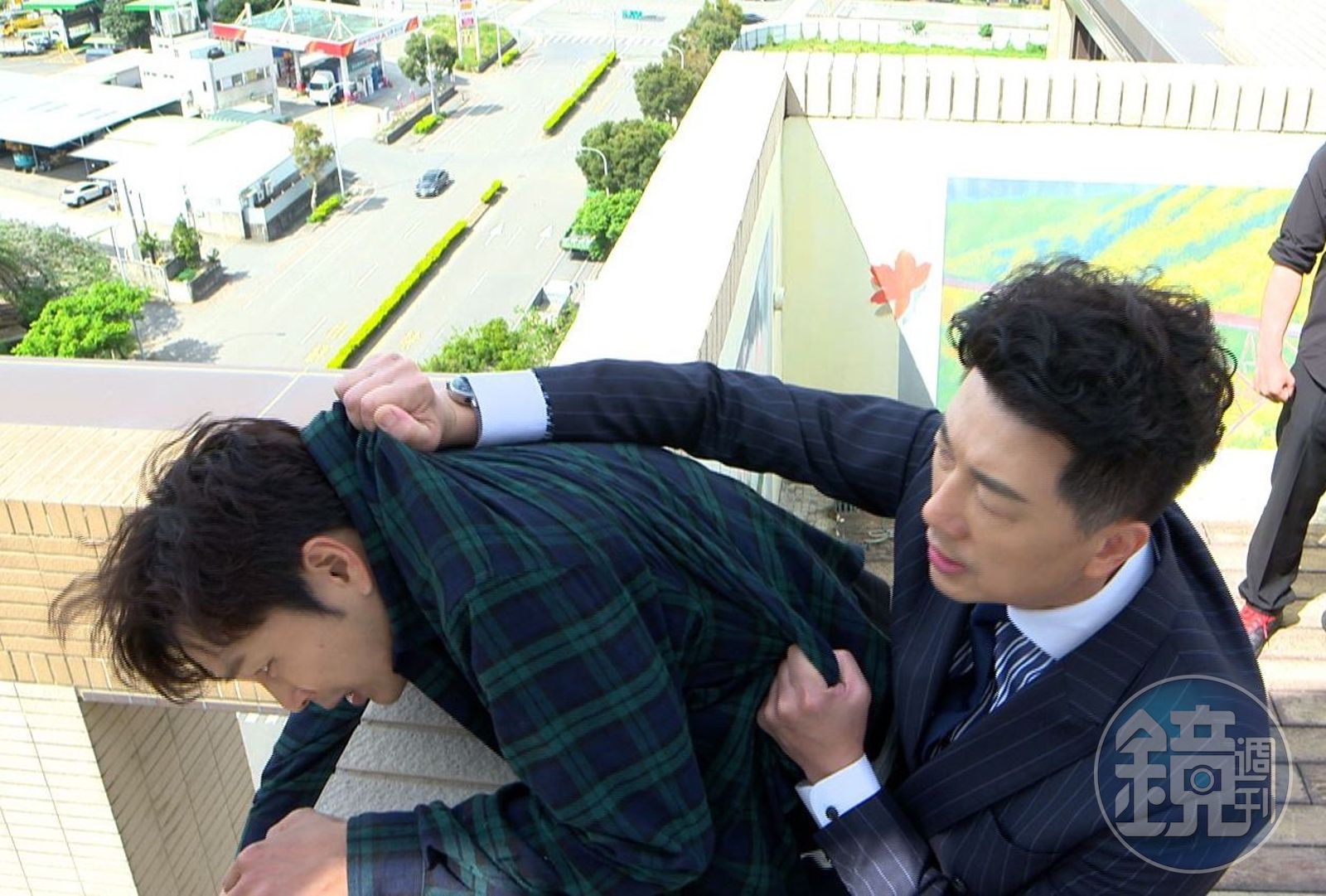 《黃金歲月》吳皓昇把張書偉架到牆邊,驚險場面值得期待。(民視提供)這一場戲是張書偉被發現是裝傻臥底,而吳皓昇為了證明他沒有說謊,就抓他到頂樓,作勢要從高樓推他,逼得他下跪求饒。兩人在天臺打鬥的動作戲,也讓懼高症的吳皓昇捏一把冷汗,他說一靠近牆邊,頭皮跟腳底瞬間發麻,不過敬業的兩人隨即投入在表演中,拳拳到位。