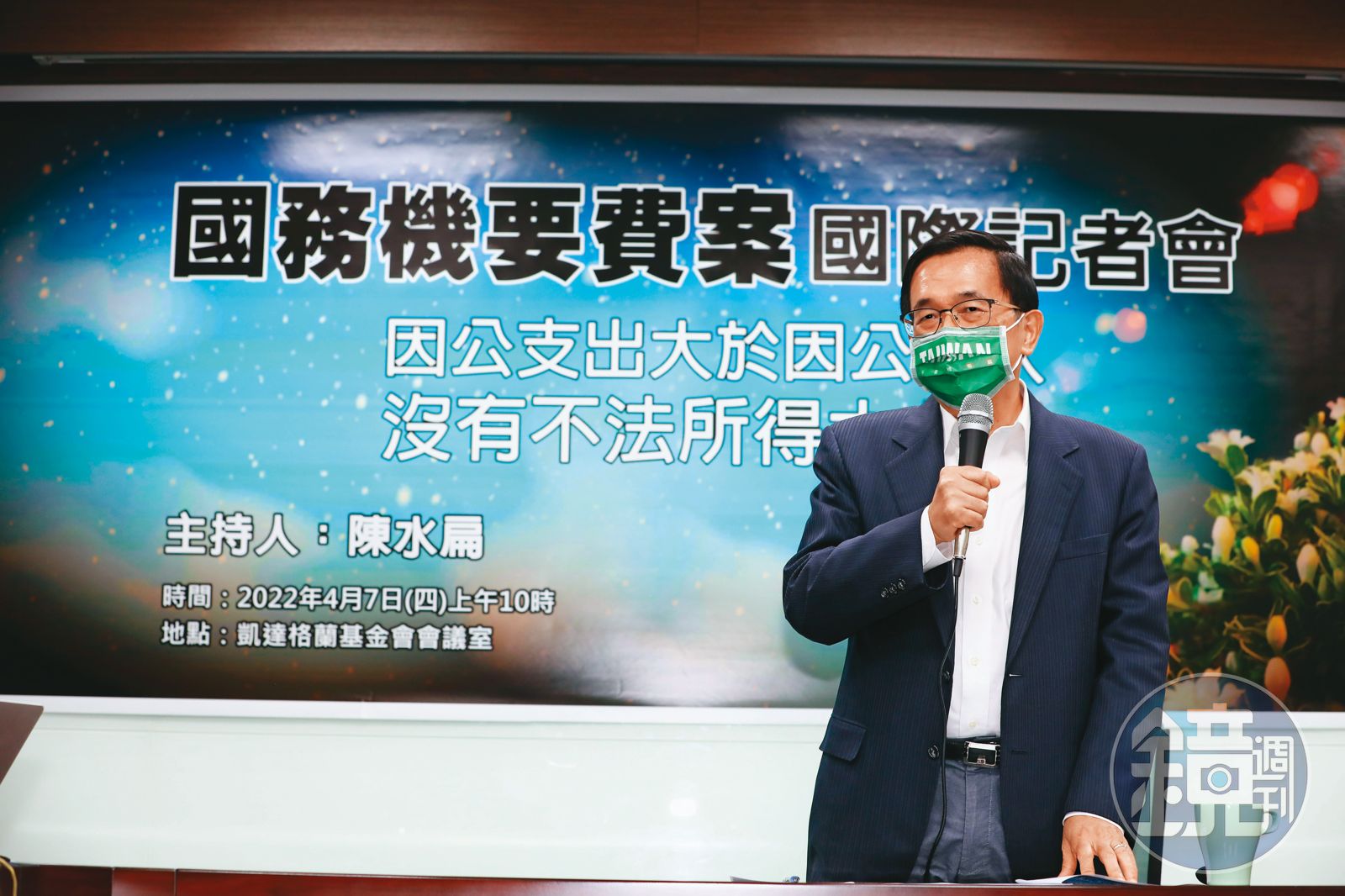 因失智、帕金森氏症等病保外就醫的前總統陳水扁,特別選在4月7日言論自由日這天召開記者會,說明遭起訴的貪汙總金額1億400餘萬元,比用於機密外交與資助犒賞餽贈的1億3,300餘萬元還少,「生食都無夠,哪有通曝乾!」藉此強調自己絕未貪汙。