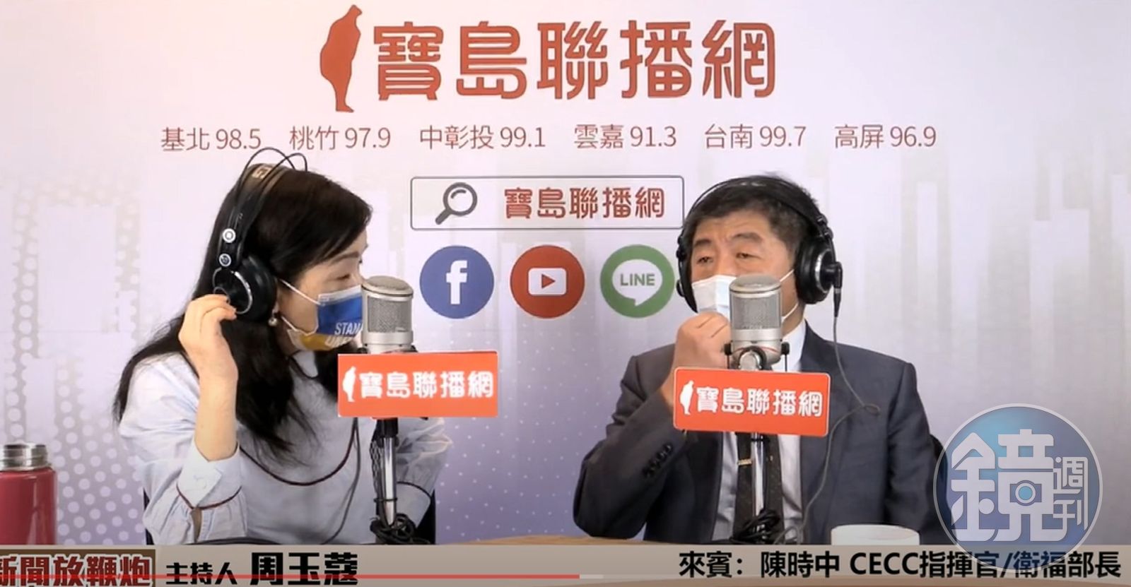 周玉蔻詢問,月底恐迎來單日破千例,台灣民眾該如何做好心理建設?陳時中表示,要民眾好好溝通,讓大家能明白目前的輕症化現象,大家怎麼共同抗疫,讓它起來不要太快、自主應變要做好」,強調「恐慌是沒有必要的,大家起而行是有必要的」。