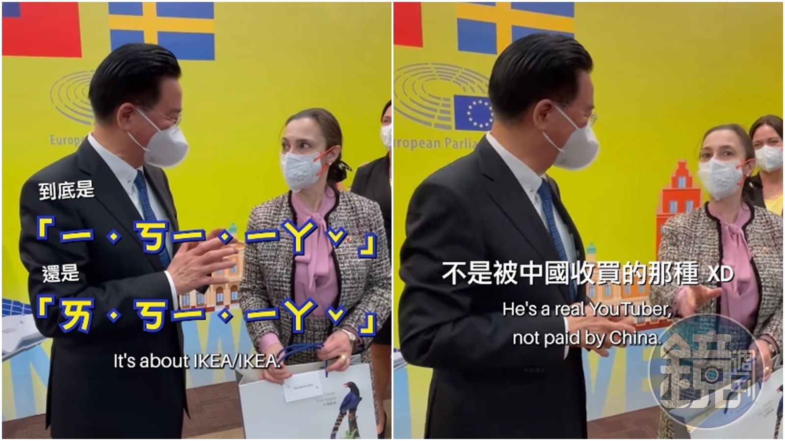 外交部昨日晚間發布一則影片,可見吳釗燮請教歐柏莉發音問題,「IKEA到底是一 ㄎ一 ㄧㄚˇ?還是ㄞ ㄎ一 ㄧㄚˇ?」歐柏莉則回應,關於這點可以去看盧卡斯YouTube影片,他在訪談中也提及同樣的問題,因此需要先行保密,歐柏莉最後不忘強調「他(盧卡斯)是正港的YouTuber,不會被中國收買的那一種。」