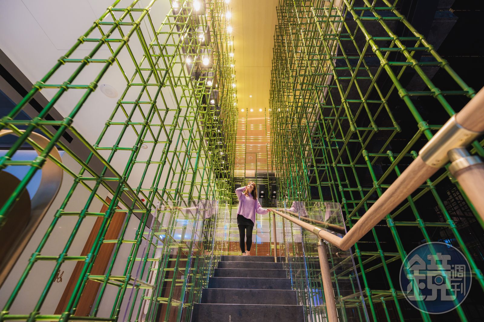 1樓至2樓的樓梯間,以綠色金屬管線鋪陳,延伸兩層樓,象徵隱身在都市中的一片竹林,住客宛如走進綠意裡,身心悠然放鬆。電梯口則設置視覺影像藝術作品,藝術家透過緩慢的燭火影片,進一步引導旅客將身心靈都沉澱下來,靜心體驗這座「城市桃花源」。
