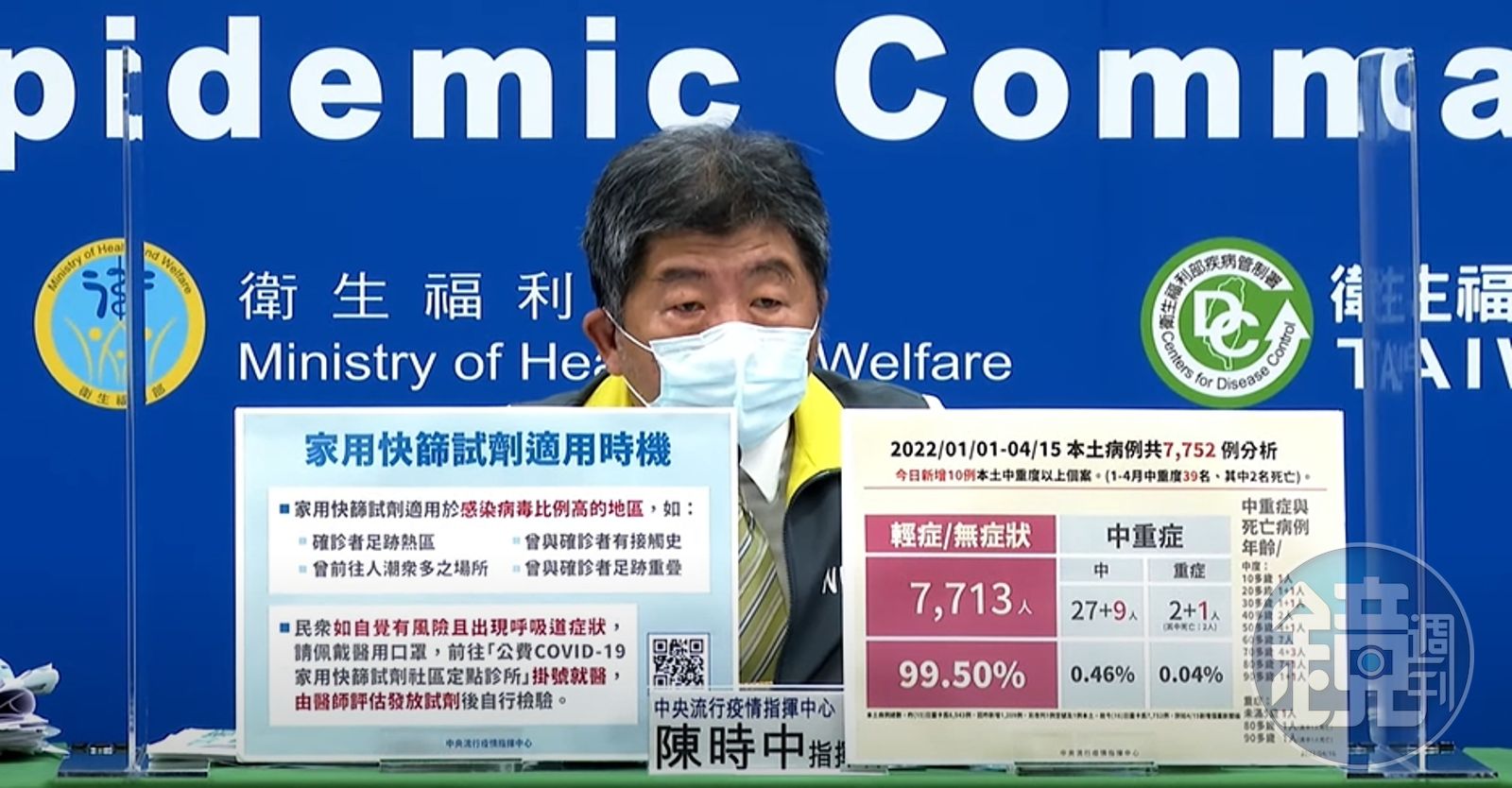 針對中重症病例,陳時中表示,截至今年病例中症率0.46%、重症率0.04%,其中死亡維持2人,分別為未接種疫苗和打2劑AZ。羅一鈞指出,重症患者為未滿5歲男童,沒有接種疫苗,出現急性腦炎併多重器官異常,在加護病房使用呼吸器,藥物則用上類固醇、免疫調節劑、無慢性病史。