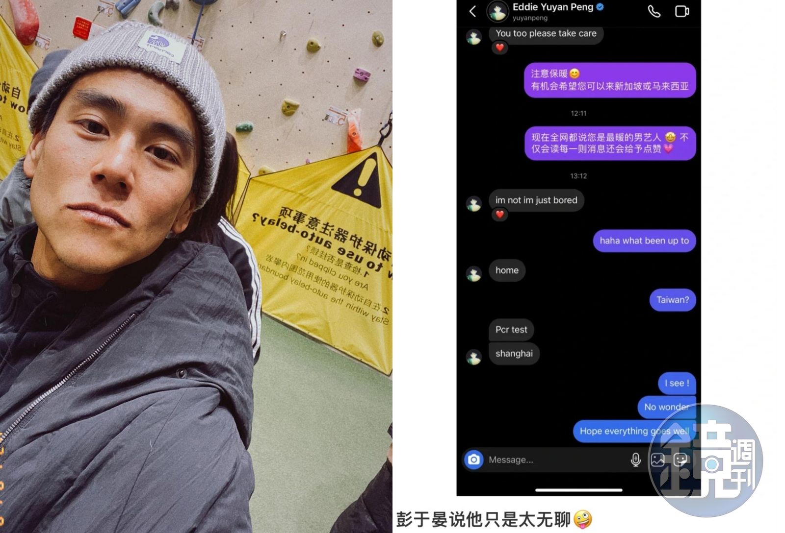 過往發文沒那麼頻繁的他,最近因為無工可開又出不了門,每天在家閒到發慌的他,在社群超活躍,除了持續分享手做餐點外,還瘋狂在網上衝浪,只要IG限動有標記他的發文,他都會去按讚,甚至留言聊天。粉絲私訊誇他「現在全網都說你是最暖的男藝人,不僅會讀每一則訊息,還會給予點讚。」彭于晏卻回「im not im just bored」(我不是(暖男),我只是閒著無聊),還告訴網友自己每天被關在家裡無所事事,不然就是去做PCR核酸檢測。