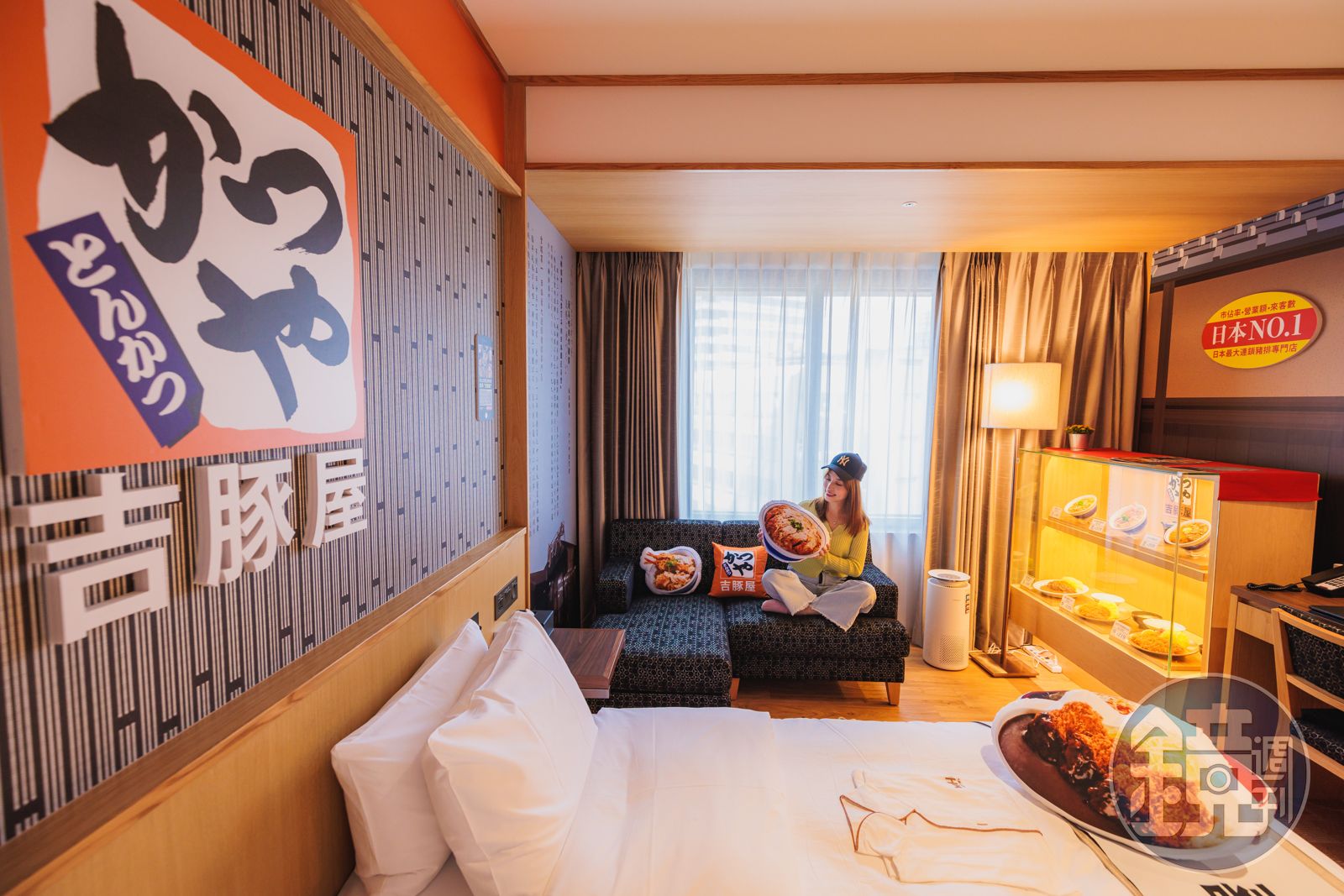 入住「歡迎光臨吉豚屋」主題房的感受最奇妙,從門口開始就有吉豚屋的門聯,房內還設置擬真食物櫃,有咖哩飯、炸豬排飯、天婦羅丼飯,就連抱枕也是食物抱枕,住在裡面彷彿聞到日本國民美食的香味!最趣味的是,房內還提供QR code,住客一掃就能訂購以上食物,立刻大飽口福。