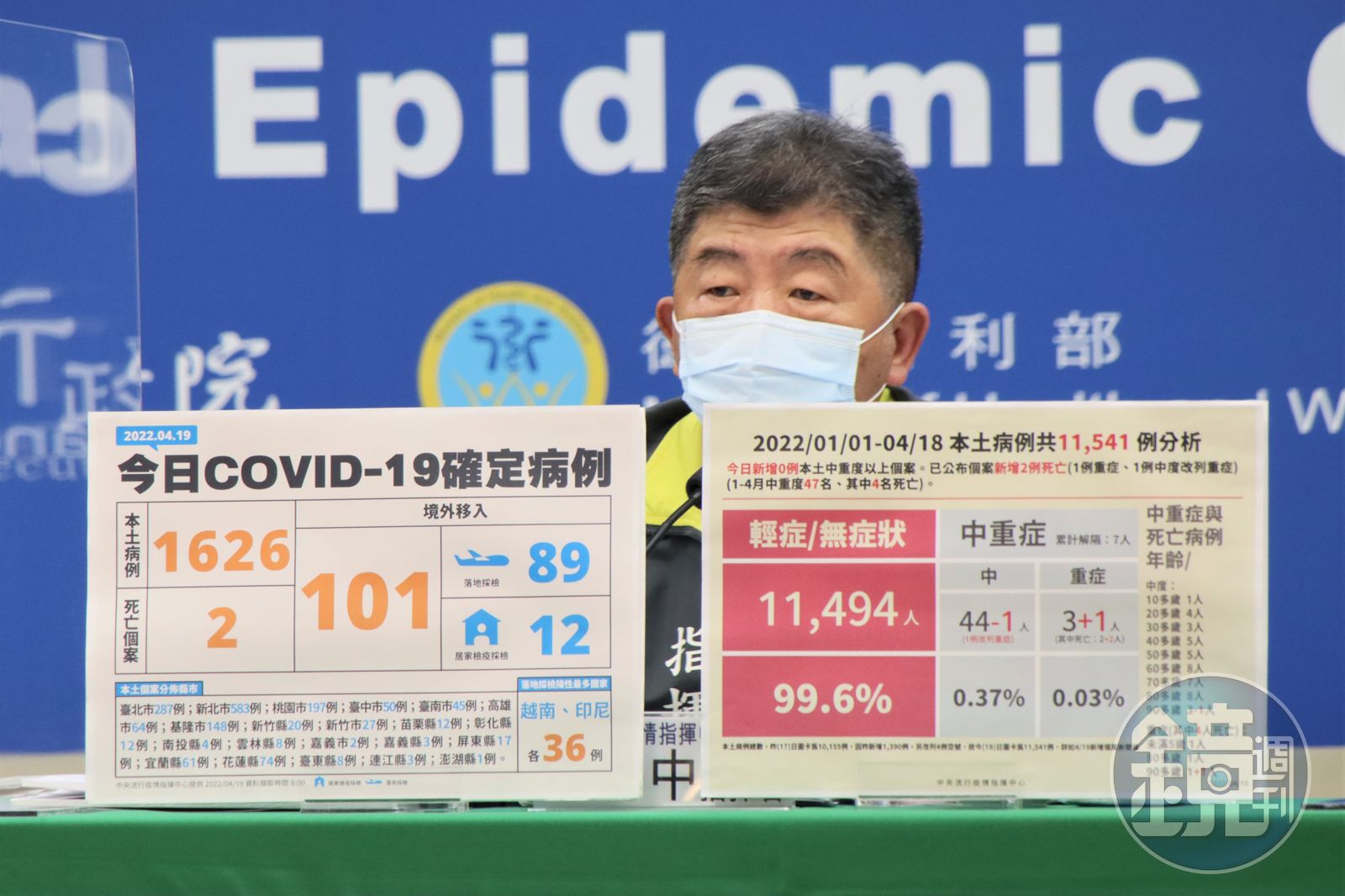 指揮中心指出,今日新增2例死亡個案(案30297、案31553),分別為90多歲及未滿5歲男性,皆於今年4月13日發病,分別於4月14日及4月15日確診,屬重度感染個案,其中90多歲男性個案已接種3劑COVID-19疫苗且具慢性病史。兩案於住院治療期間使用瑞德西韋等藥物治療,分別於4月16日及4月19日死亡。指揮官陳時中也表示,「接到這訊息深感不捨,不過整體醫護人員、雙和、台大也好,這些專家都盡了很大力氣,整體當然有需要檢討改進的地方。」陳時中指出,明天下午會請兒科專家討論送醫指引或相關的注意事項,討論出來後再跟大家報告。