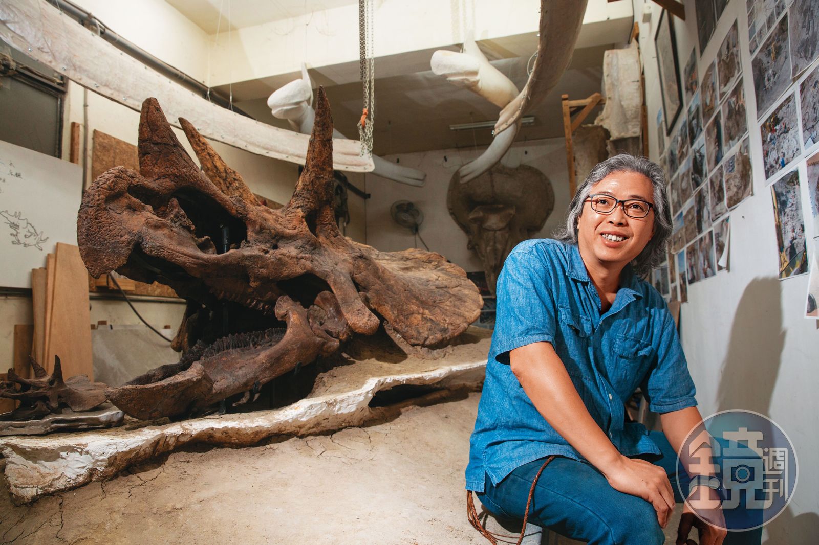 化石先生的工作室藏身新北土城工業區,推開門,幾乎是一輛房車大的三角龍頭骨霸氣坐鎮,沒有隔離的紅線、禁止觸碰的告示,與來客正面對決,帶來的衝擊,比隔壁工廠傳來的沖床聲更讓人震撼。
