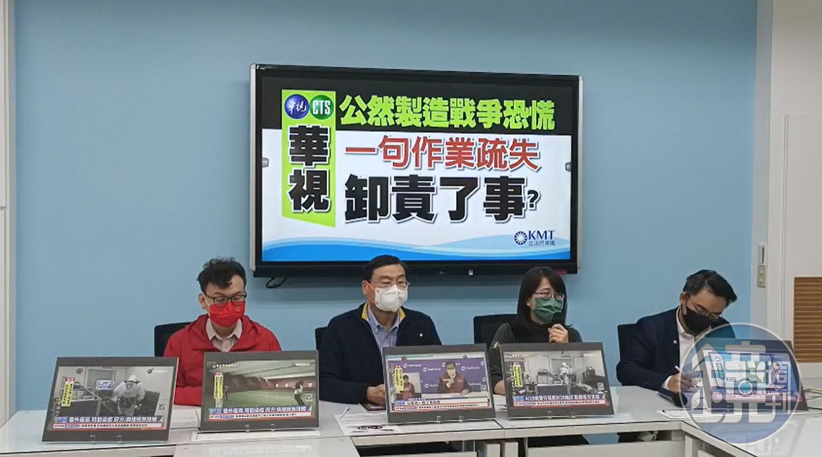立法院國民黨團上午召開「華視公然製造戰爭恐慌,一句作業疏失卸責了事?」記者會,總召曾銘宗痛批,從未看過新聞台有如此誇張錯誤,「萬一明天選舉日呢?」執政黨是不是已經錄好影片要在年底播放?國民黨團要求NCC查辦甚至撤照、李永得公開道歉、華視的董事長及總經理該下台負責。