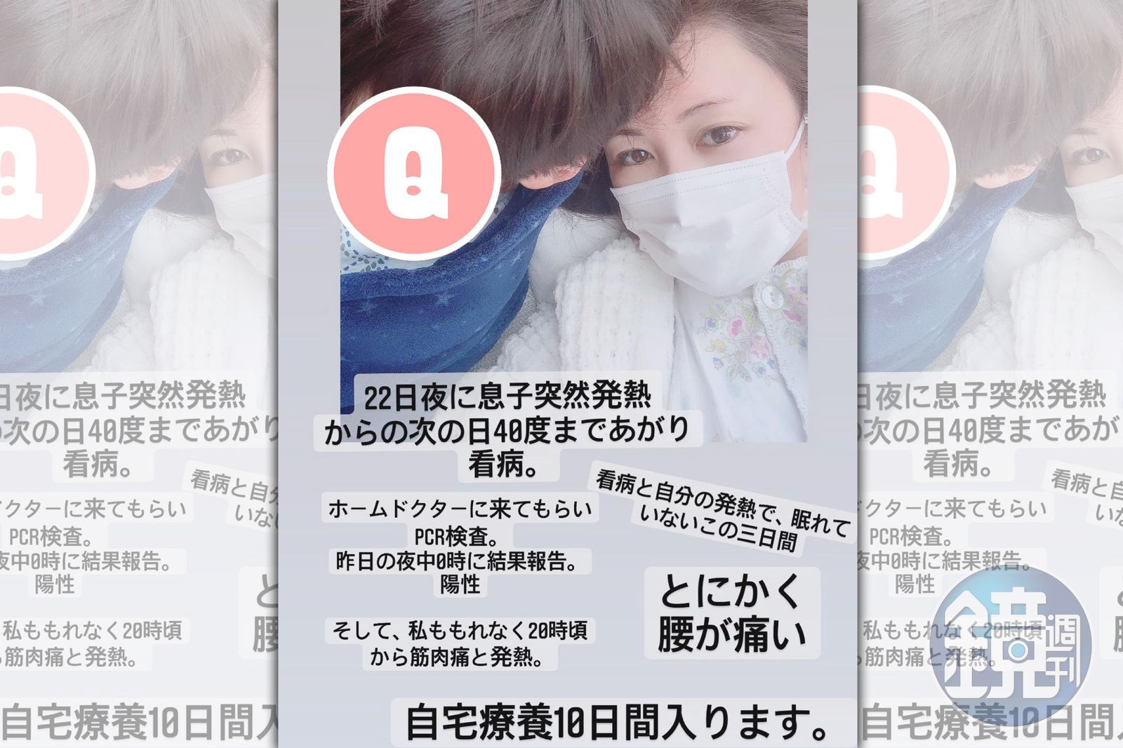 之後麻衣表示,她自己也感覺發冷、腰酸,疑似確診症狀,但她還是努力打起精神照顧兒子,並且多給兒子吃蛋、粥、青菜和水果,還好兒子食欲有恢復。麻衣表示她3天睡不好覺,晚上8點開始肌肉痛、發燒等症狀,於是和兒子開始了「10天的單親隔離生活」。