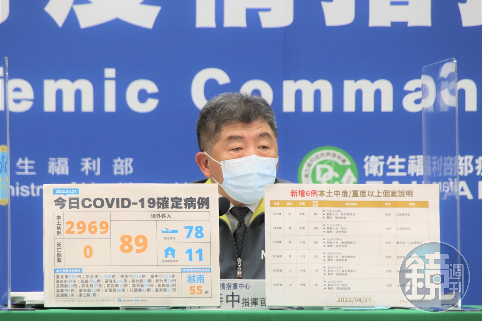 截至20日統計,共有1萬5,544例個案,今日並無新增重症,輕症無症狀的是99.60%,中症0.37%、重症是0.03%;新增之中症患者均為50歲以上,有2人打3劑仍中症,另有2人完全沒打過疫苗。