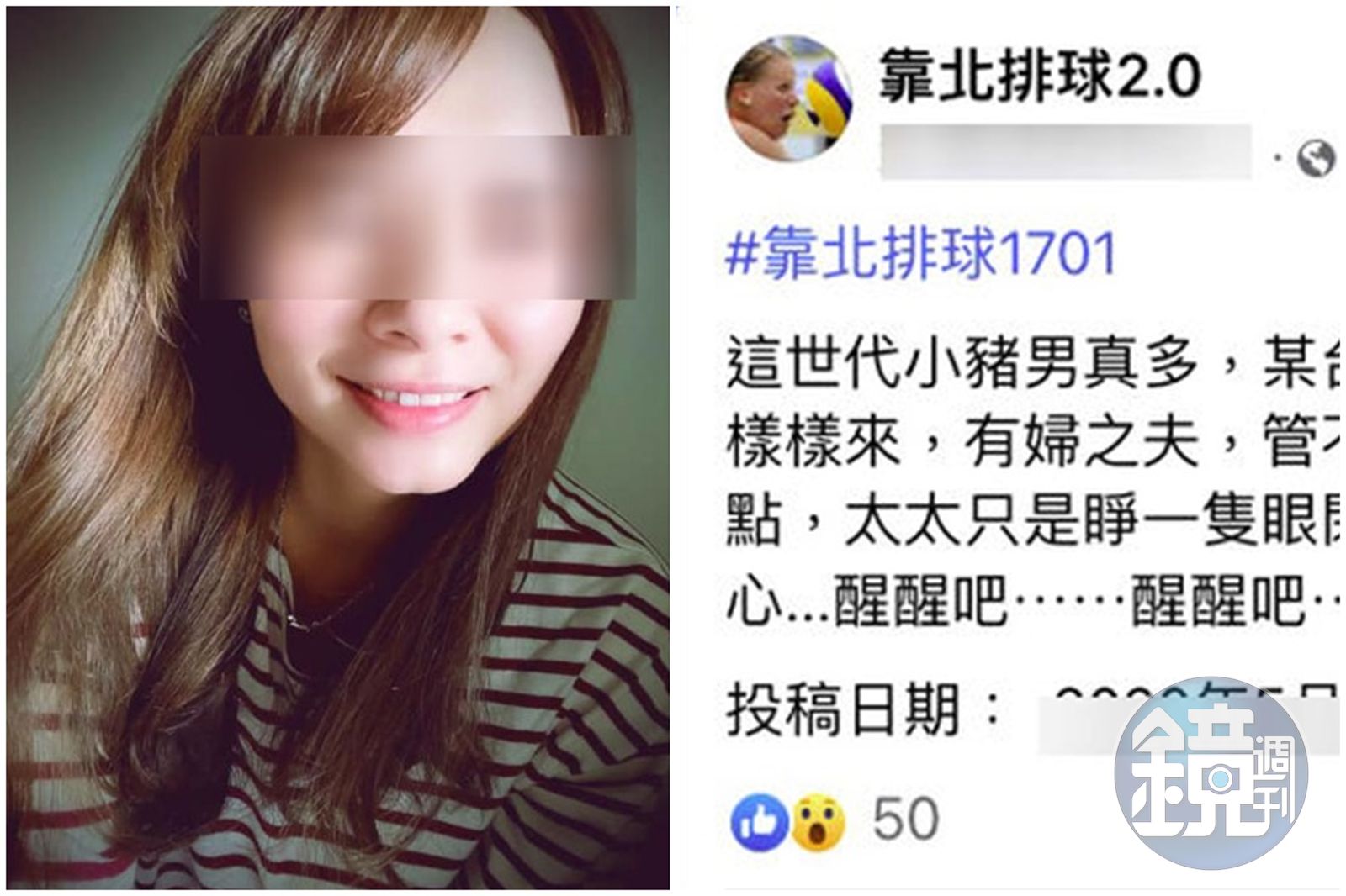 臉書「靠北排球」粉絲專頁爆料「這世代小豬男真多,某台南某某小學教練,劈腿、約炮樣樣來,有婦之夫,管不住自己的小弟弟,潔身自愛一點,太太只是睜一隻眼閉一隻眼,還拍片,真的是...噁心...醒醒吧⋯⋯醒醒吧⋯⋯」,雖文章未指名道姓,不過該教練的老婆看到,直接高調嗆小三,「看顏值就不會輸了⋯你那種顏值送我都不要」,還表示曾到學校找小三對質。