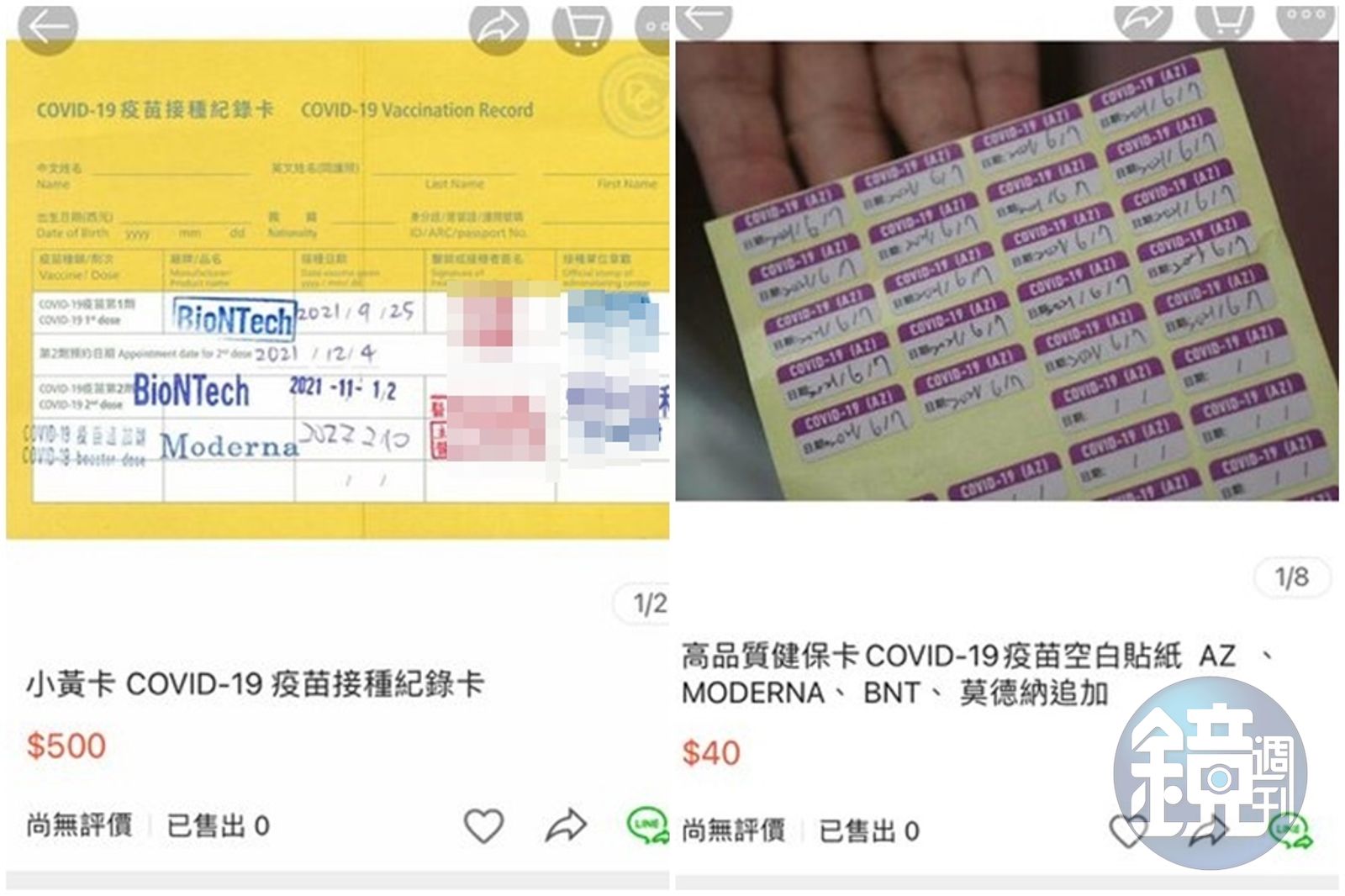 原PO提供多張網拍截圖,該賣家販售打滿3劑的小黃卡,一張售價500元,商品種類歸在「文創商品」,數量有4張,商品敘述寫著「紙本疫苗接種,複製品,可當替代品使用,把真品放在家裡,免弄丟疑慮」,更強調小黃卡已蓋疫苗接種章,姓名、身分證可自行填寫,標榜「真假難辨,出去玩、上健身房、出入8大場所快速通關」,從小黃卡外,健保卡上的疫苗貼紙也有販售。