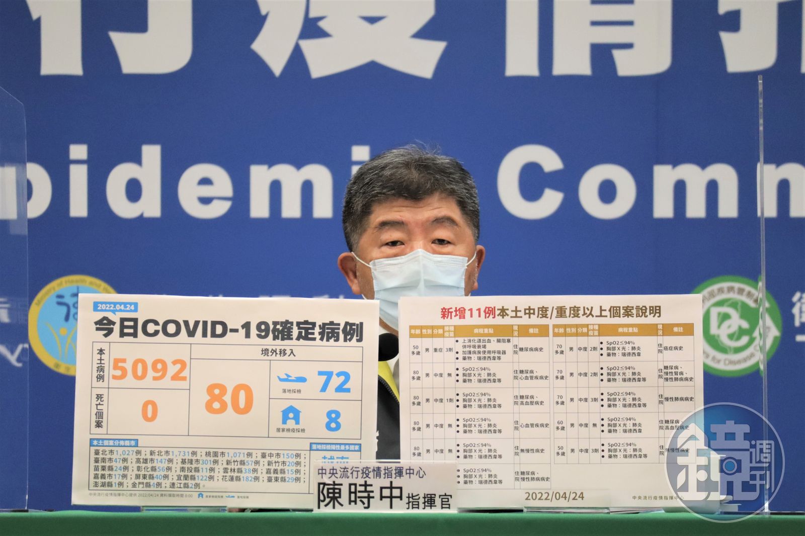 指揮中心表示,今日新增之5,092例本土病例,為2,446例男性、2,641例女性、5例調查中,年齡介於未滿5歲至90歲以上,發病日介於今年2月23日至4月24日,其中包含2,957例為無症狀感染。個案分布為新北市(1,731例),桃園市(1,071例),台北市(1,027例),基隆市(301例),花蓮縣(182例),台中市(150例),高雄市(147例),宜蘭縣(122例),新竹縣(57例),彰化縣(56例),台南市(47例),屏東縣(40例),雲林縣(38例),台東縣(29例),苗栗縣(24例),新竹市(20例),嘉義市(17例),嘉義縣(15例),南投縣(11例),金門縣(4例),連江縣(2例),澎湖縣(1例)。相關疫情調查持續進行中。