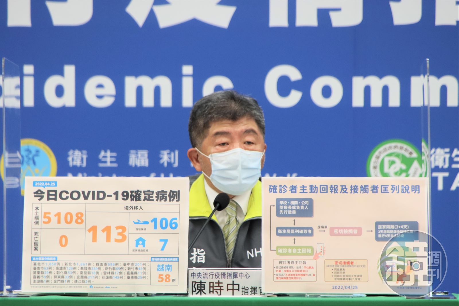 指揮中心表示,今天新增的5,108例本土病例,為2,488例男性、2,588例女性、32例調查中,年齡介於未滿5歲至90歲以上,發病日介於2022年3月28日至4月24日,其中包含2,982例為無症狀感染。個案分佈為新北市(1,861例),台北市(1,050例),桃園市(696例),基隆市(339例),宜蘭縣(317例),台中市(201例),花蓮縣(148例),高雄市(126例),新竹縣(65例),台南市(63例),彰化縣(53例),新竹市(43例),屏東縣(33例),苗栗縣(29例),台東縣(25例),南投縣(18例),雲林縣(17例),嘉義縣(11例),嘉義市(9例),連江縣(2例),金門縣及澎湖縣(各1例),相關疫情調查持續進行中。
