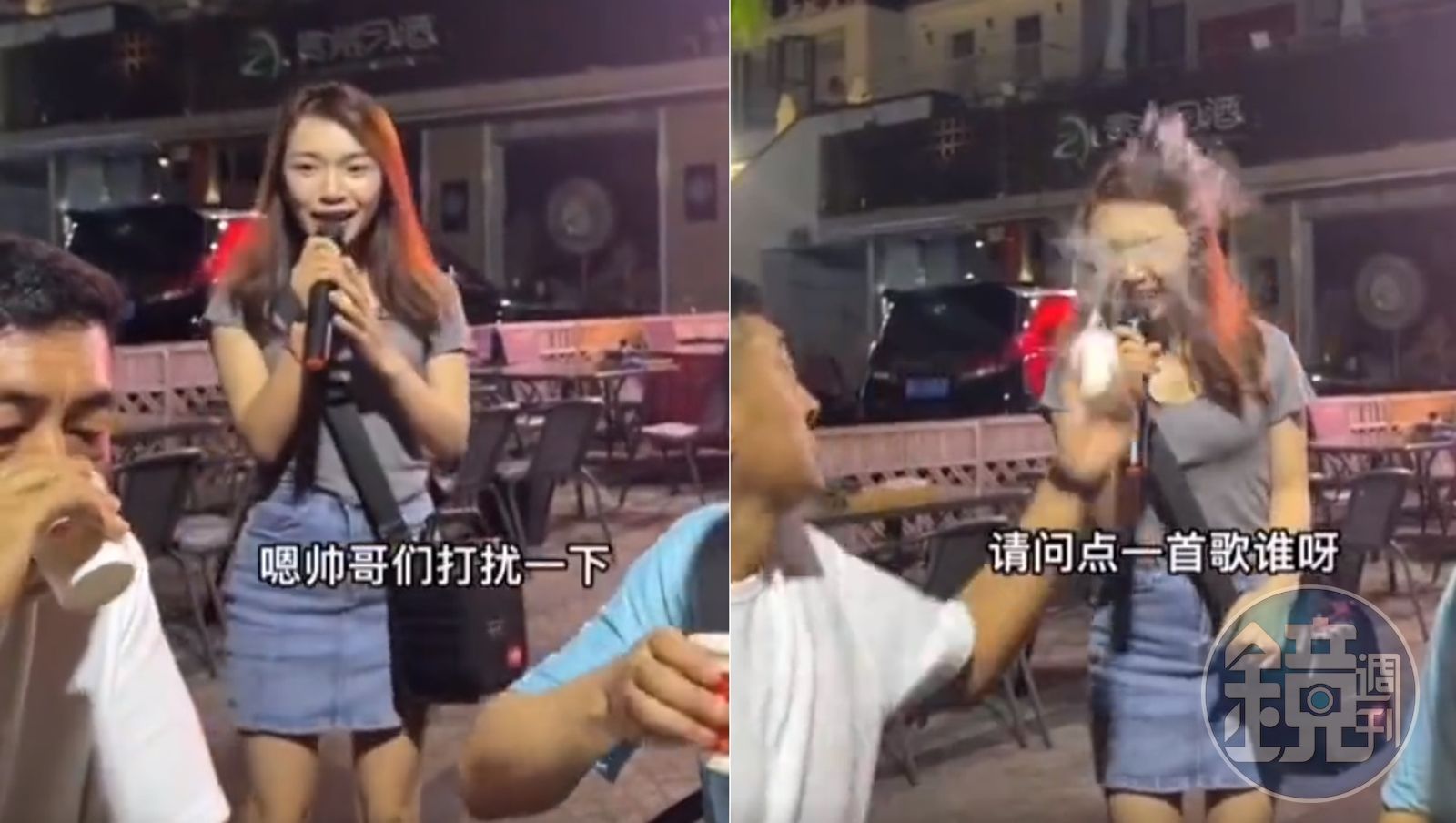 該段在微博流傳的影片顯示,位在海南三亞的某處夜市中,一名手拿著麥克風賣唱的女子站在2個坐著用餐的男子背後,出聲問道「打擾一下」,想請他們點一首歌,未料此時畫面左方的男子竟突然拿起桌上的一杯酒,直直往女子臉上潑灑。女子震驚之餘趕緊抹去臉上的酒水、恢復鎮定,這時畫面右側的男子出來打圓場,說另一名男子喝多了,向女子表示不好意思,並問女子唱一首歌要多少錢,女子答道1首10元人民幣,右側男子則說那要不然他出100元,請女子唱一首拿手歌就好。
