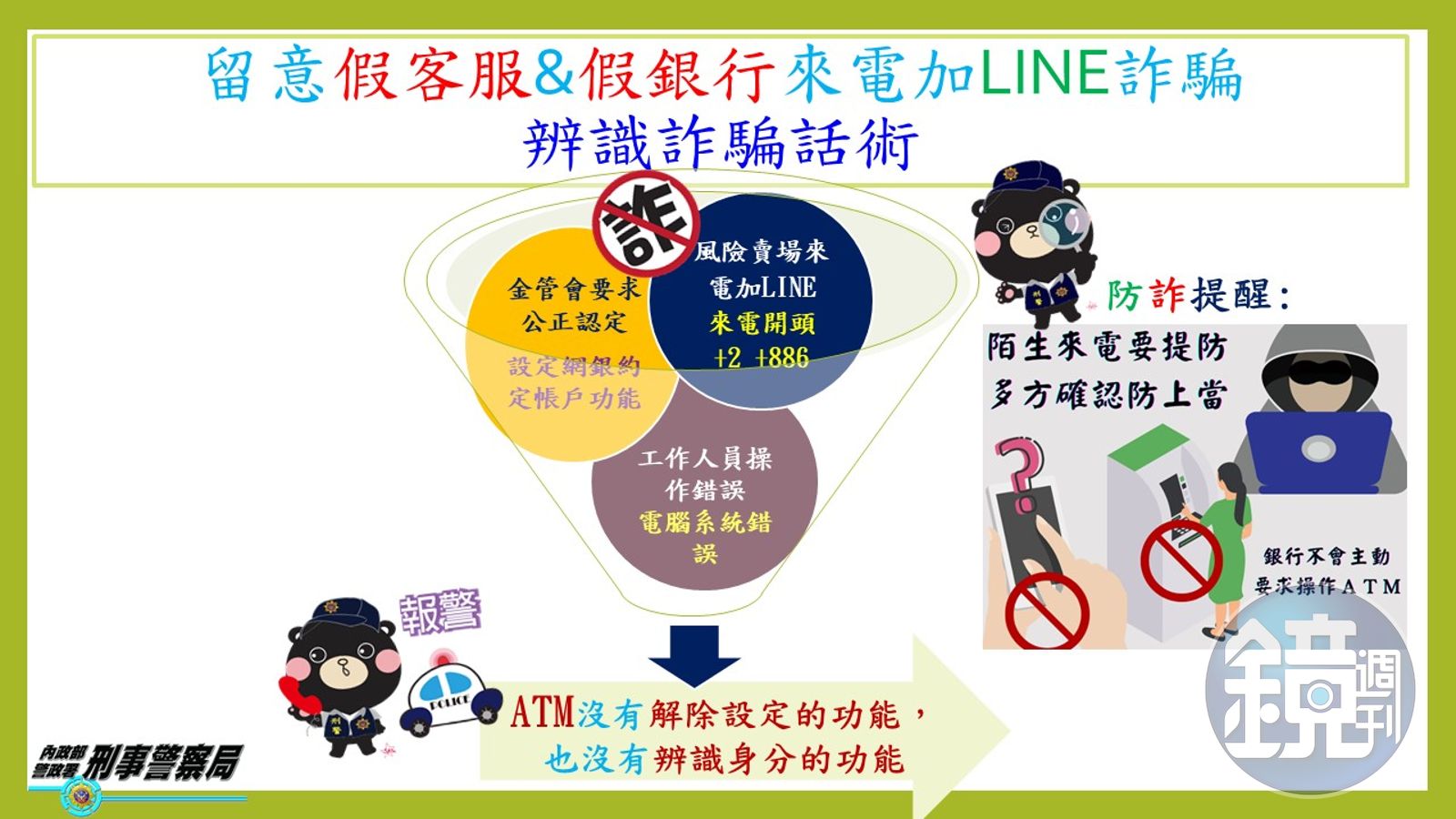 刑事局指出,詐騙集團冒用知名公司,以「金管會要求公正認定、工作人員操作錯誤及電腦系統錯誤,要求訂戶設定網銀約定帳戶功能,以APP或前往ATM設定解除分期詐騙手法,若接到來電顯示開頭為「+2」「+886」等為詐騙電話,聽到關鍵字「解除ATM設定」「誤刷條碼」「誤設訂單」「重複扣款」「至ATM操作鎖住帳號」等關鍵字,請立即掛掉。