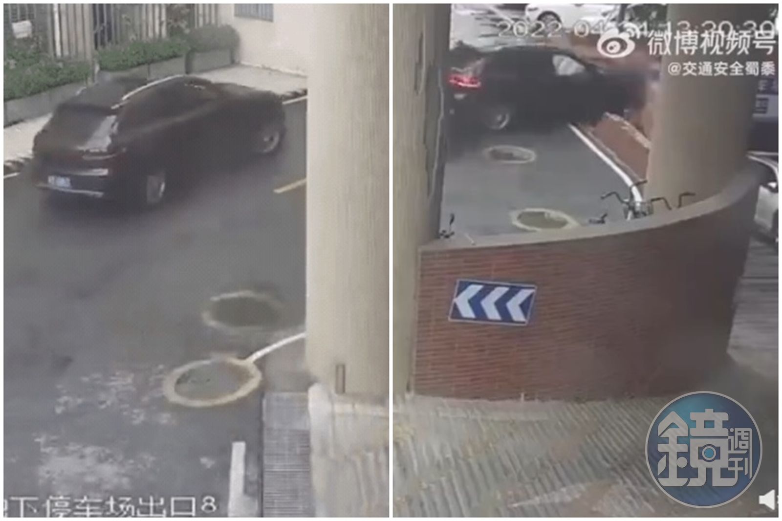 一台保時捷要離開停車場,轉彎後疑似把油門當成煞車踩,車輛突然暴衝直接撞破圍牆。(翻攝微博)發布時間:2022.04.27 10:40 臺北時間